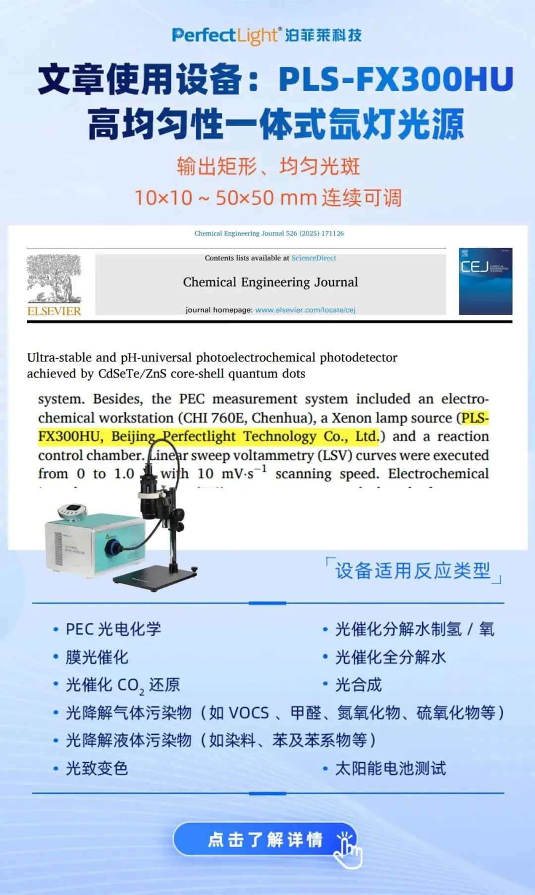 关键词:Perfectlight; 泊菲莱; PLS-FX300HU; 氙灯光源; 光电催化实验光源; UV-NIR 宽光谱; 长时连续照射; 高能量密度; 滤光片联用; 反应器联用; 光催化; 光电化学 PEC; Chemical Engineering Journal 2025