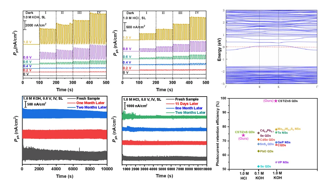 采用CdSeTe/ZnS核壳量子点构筑光电化学探测器在强酸、中性和强碱电解液中均表现出优异且稳定的光电响应,成功解决了镉基半导体材料在酸性电解液中易腐蚀解离的问题,并且在1.0 M KOH和1.0 M HCl中,一个月后光电流保留效率高达98.1%和74%,展现出卓越的长期工作稳定性。