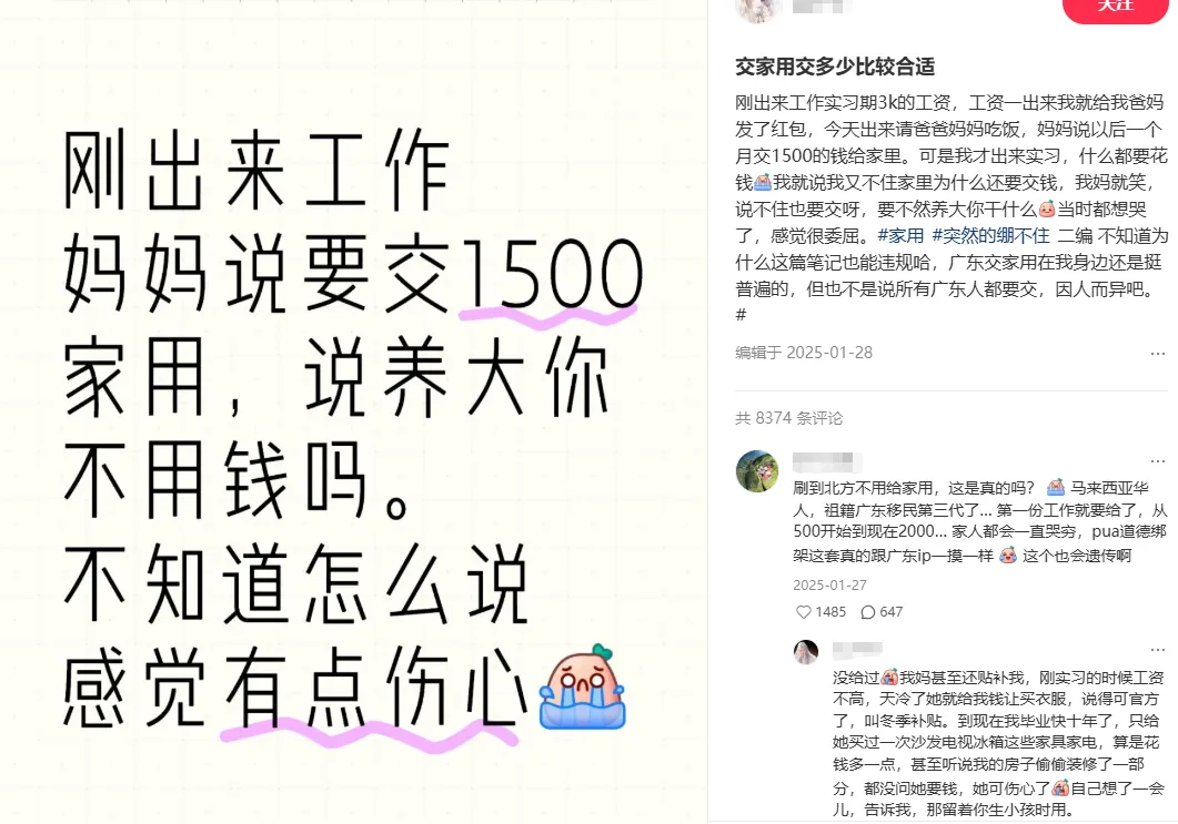 说起来,交家用也有一定的情感逻辑,将经济支持视为孝心与责任的一部分,是维系家庭共同体、反哺养育之恩的一种方式。