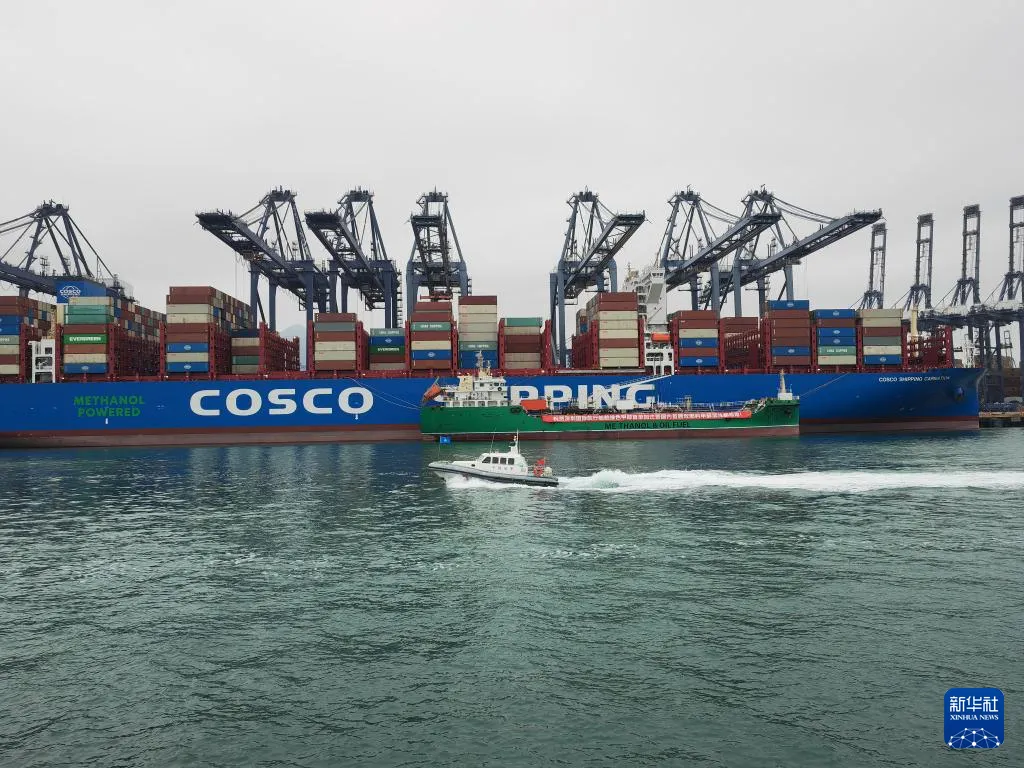 新华社深圳电(记者王丰)21日上午,我国双燃料甲醇加注船“大庆268”轮在深圳港盐田港区为国际航行集装箱船“中远海运康乃馨”轮,成功加注200吨绿色甲醇燃料,这标志着深圳港具备了绿色甲醇加注服务能力。01月21日,双燃料甲醇加注船“大庆268”轮在深圳港盐田港区为“中远海运康乃馨”轮加注绿色甲醇燃料