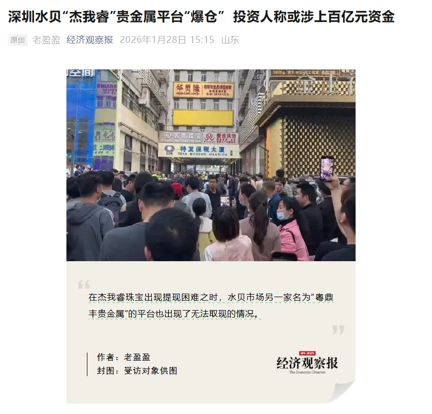 2026年1月下旬,深圳水贝黄金珠宝市场的深圳市杰我睿珠宝有限公司(简称"杰我睿")及其关联平台突然陷入兑付危机,用户无法正常提现或提取实物黄金。