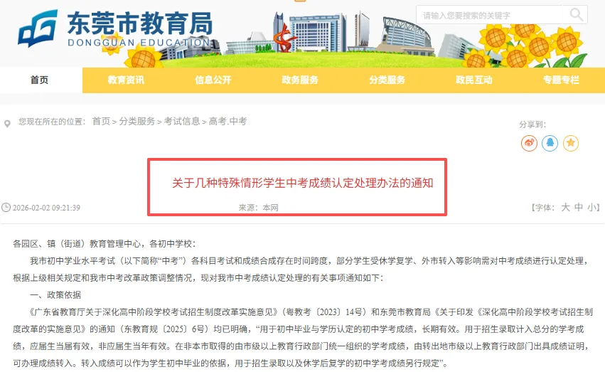 今天(2026年2月2日,星期一),东莞市教育局在官网发布《关于几种特殊情形学生中考成绩认定处理办法的通知》(以下简称“通知”)。