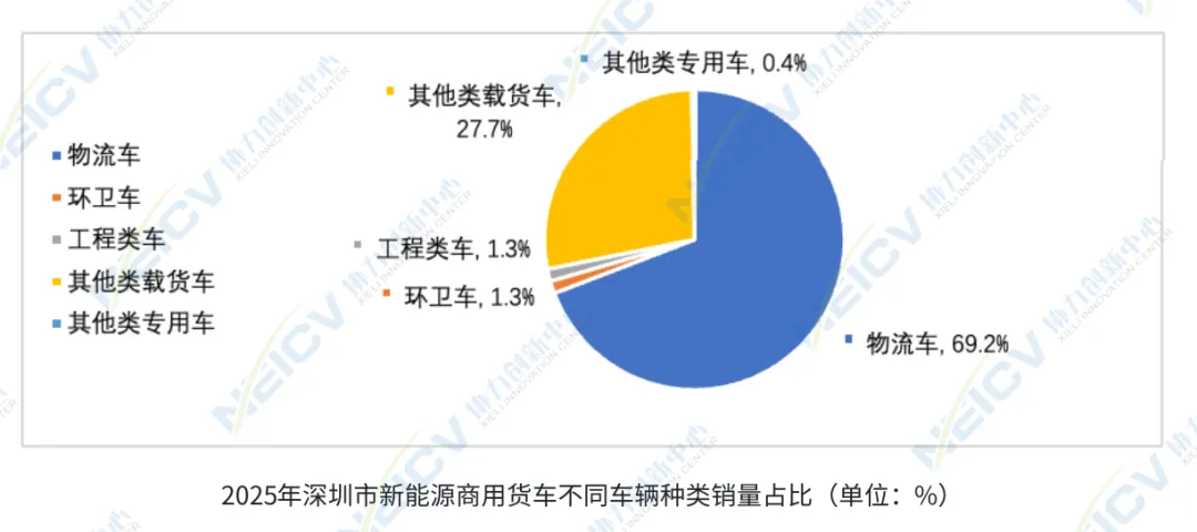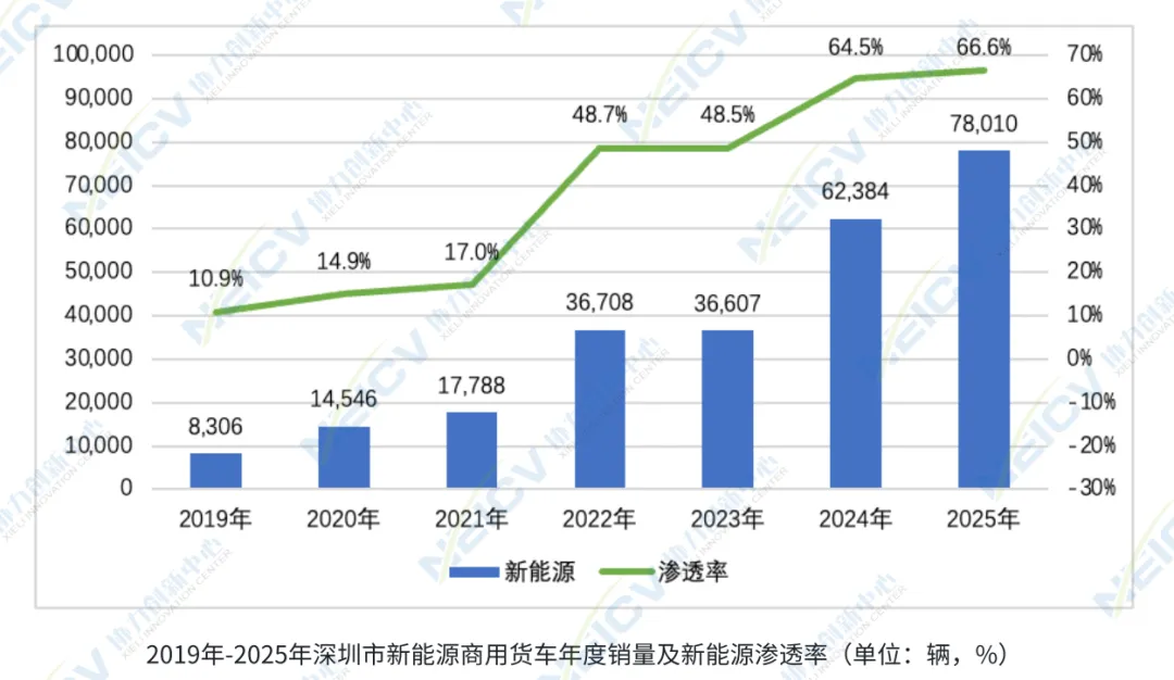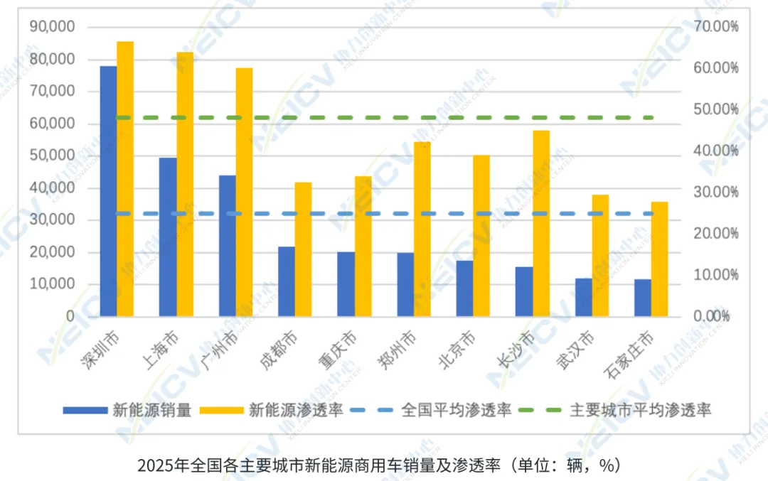 从全国视角来看,2025年全国商用货车总销量为299.5万辆,其中新能源商用货车74.9万辆,整体渗透率为25.0%。对比之下,深圳市的新能源渗透率大幅领先全国平均水平近41.6个百分点,同时也显著高于重点城市48.1%的平均水平,在全国物流配送与公共服务领域的电动化转型中发挥了标杆作用。