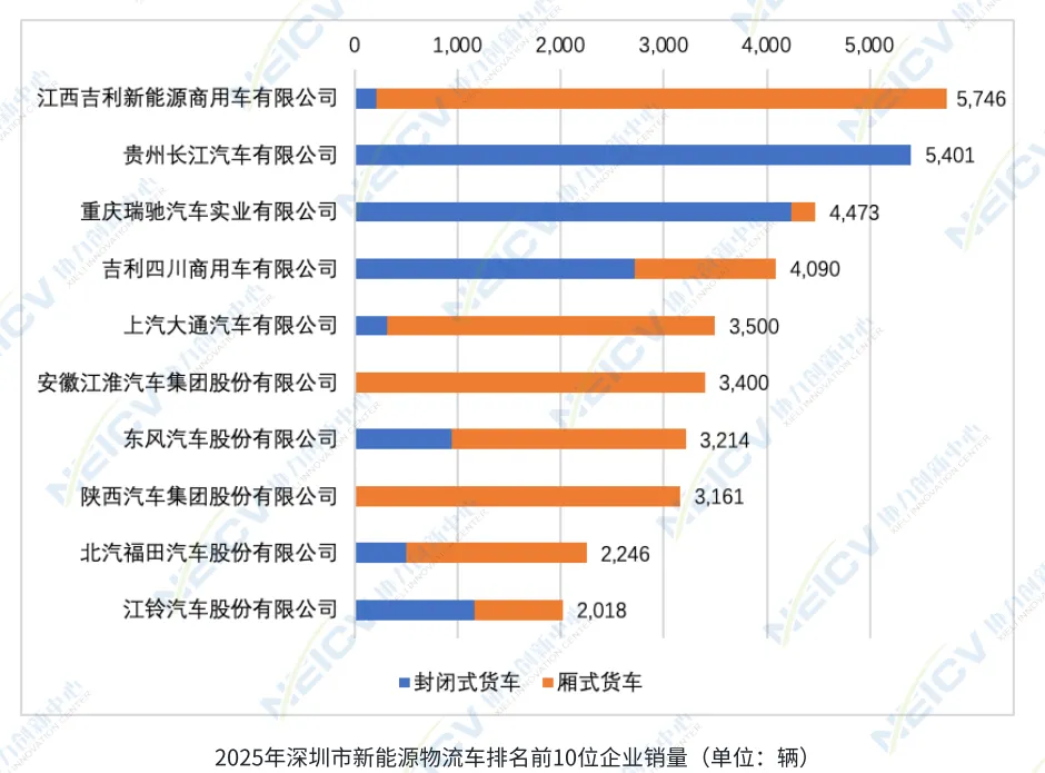 从细分车型来看,厢式货车与封闭式货车是主要销售车型,销量分别为2.9万辆和2.5万辆,占比分别为52.9%和47.1%。在能源类型上,纯电动车以5.3万辆的销量占据绝大部分市场,混合动力车与燃料电池车分别为221辆和721辆。该领域共有73家生产企业在深圳市场参与竞争,江西吉利、贵州长江及重庆瑞驰位列销量榜前三名。