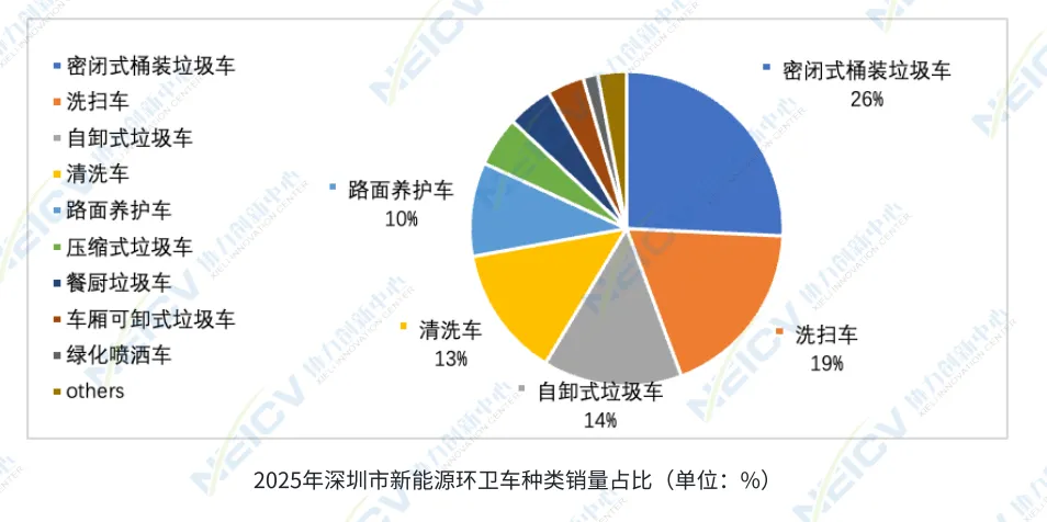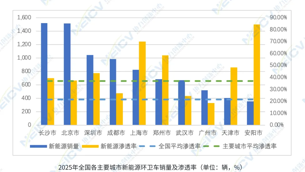 2025年,深圳市新能源环卫车销量为0.1万辆,新能源渗透率达到43.8%,较上年增加了4.8个百分点。全国新能源环卫车年销量为1.8万辆,平均渗透率为21.6%。深圳在此领域销量排名全国第三,其渗透率同样高于重点城市37.0%的平均水平。
