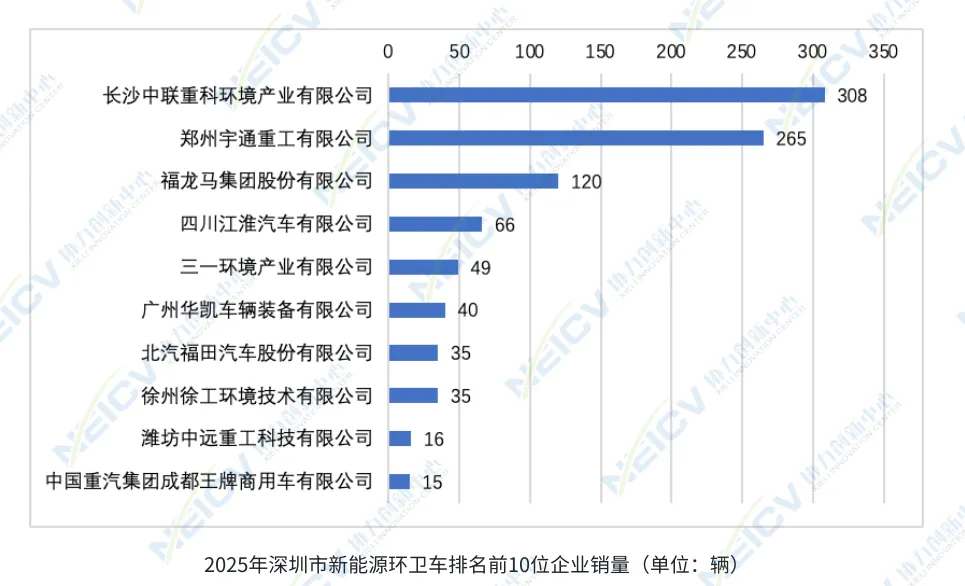 具体车型方面,主要以垃圾车、洗扫车和清洗车为主,销量分别为562辆、194辆和141辆。能源结构上,纯电动车销售0.1万辆,燃料电池车45辆。市场格局方面,共有34家企业在深销售,长沙中联重科、郑州宇通和福龙马三家公司的销量排名前三。