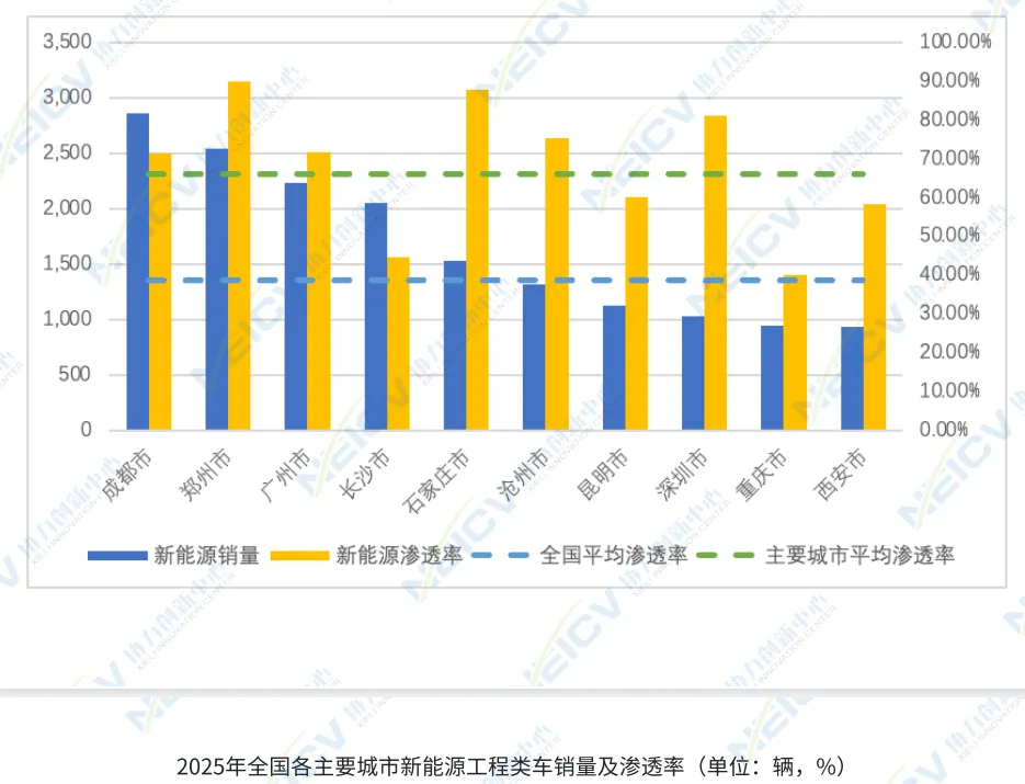 工程类车在2025年表现出极高的电动化水平。全年销量虽为0.1万辆,在全国城市中排名第八,但其新能源渗透率高达81.0%,同比大幅增加32.8个百分点。这一数据远超全国38.9%的平均水平,也高于重点城市66.0%的平均线,深圳在工程运输领域的基础设施建设与全生命周期成本优势正在逐步释放。