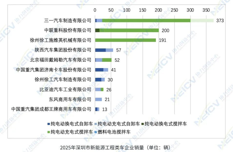 在车型分布上,混凝土搅拌车销量为787辆,自卸车为247辆。能源类型方面,纯电动车包含充电式838辆与换电式123辆,另有燃料电池车73辆。该领域共有19家生产企业在深销售,三一、中联重科和徐工占据销量前三位。