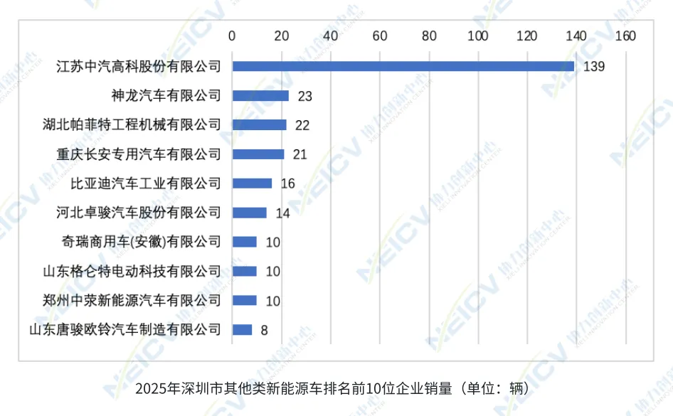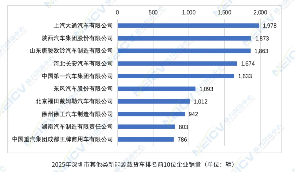 其他类新能源载货车在2025年共销售2.2万辆,渗透率为57.8%,同比增加6个百分点。其中,仓栅式货车的新能源渗透率超过90%,皮卡整体渗透率达71.8%,牵引车与载货汽车的渗透率也均在45%以上,这些数据均显著高于全国其他城市同类车型平均水平。该板块共有55家企业参与深圳市场的销售,上汽大通、陕西汽车和山东唐骏位居前三。