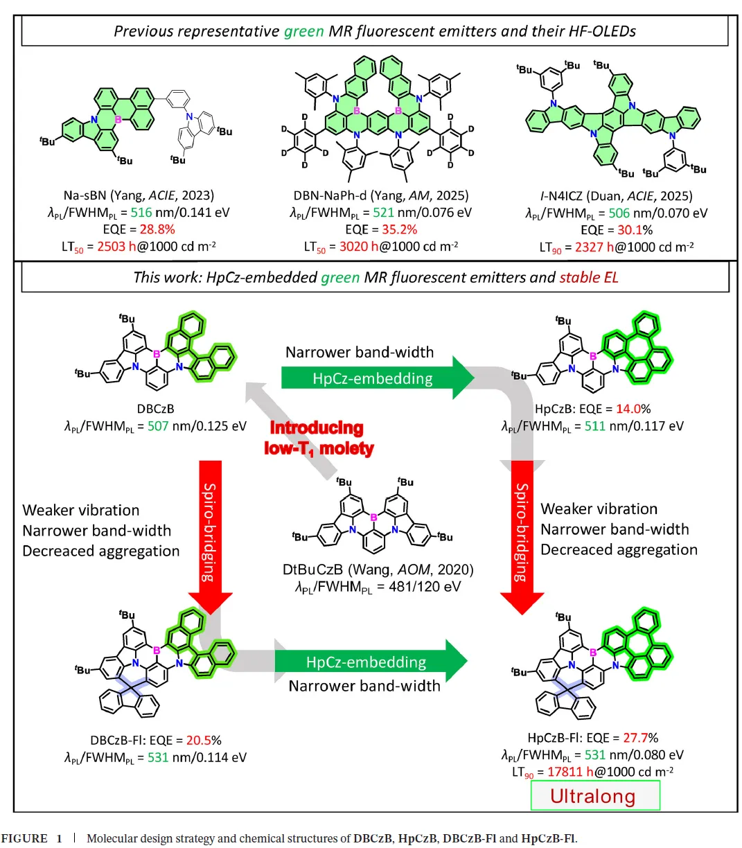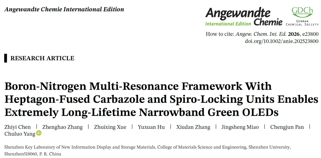 在超高清(UHD)显示技术日益发展的今天,如何同时实现高效率、窄带发射和长器件运行稳定性,一直是有机发光二极管(OLED)领域的核心难题。尤其是对于绿光发射,其色纯度对色域的提升具有至关重要的影响。深圳大学杨楚罗教授、胡宇轩副研究员团队在国际顶级期刊Angewandte Chemie International Edition上发表了题为“Boron-Nitrogen Multi-Resonance Framework With Heptagon-Fused Carbazole and Spiro-Locking Units Enables Extremely Long-Lifetime Narrowband Green OLEDs”的研究论文。该研究提出了一种协同分子设计策略:通过将七元环稠合咔唑(HpCz)与螺环锁定(Spiro-locking)单元引入硼氮(BN)多重共振(MR)框架,成功开发出具有超长器件工作寿命的窄带绿光发光材料 。📚研究背景