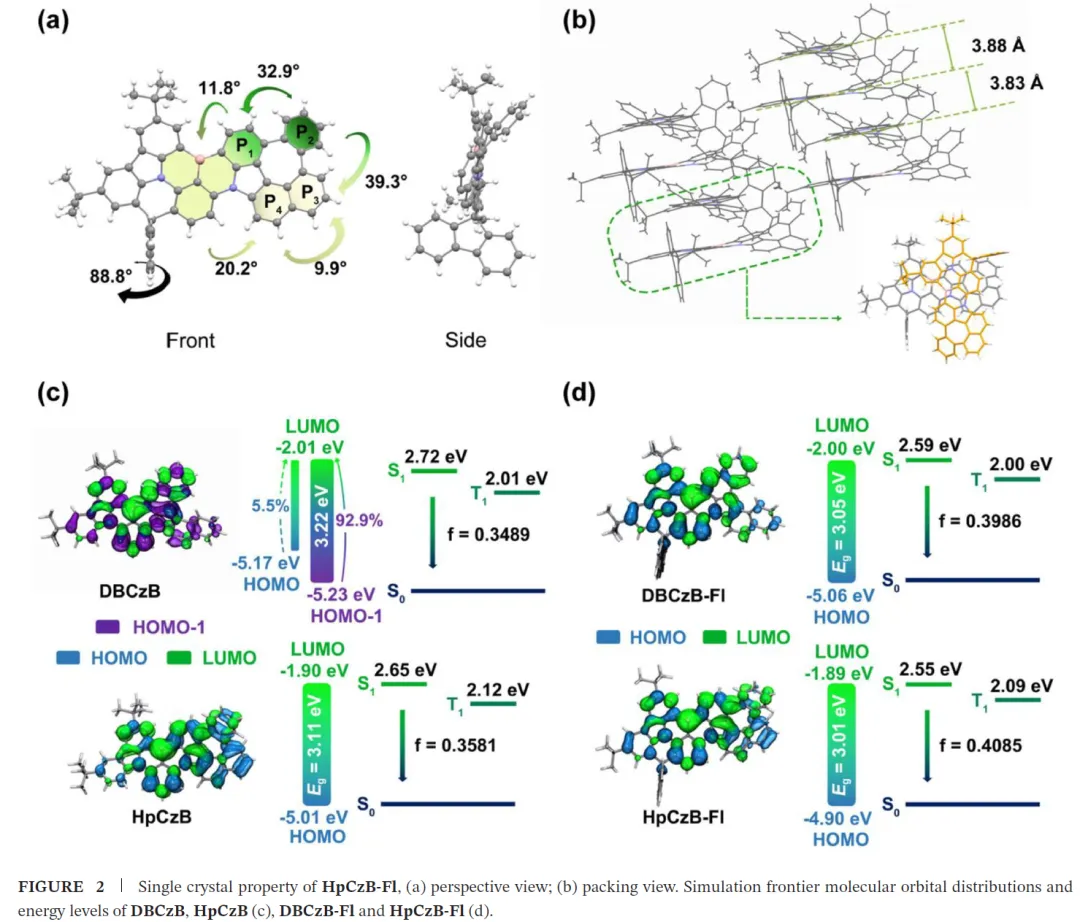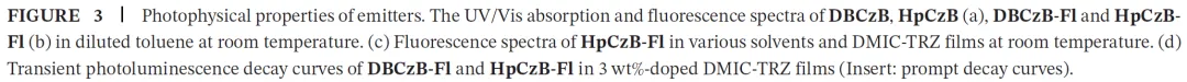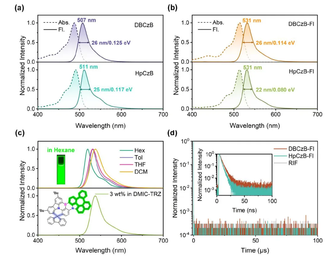 研究团队将3-氮杂二苯并[g, i, j]萘并[2, 1, 8-cde]薁(HpCz)和二苯并咔唑(DBCz)单元分别引入BN框架中,并利用螺芴桥键进行锁定,合成了四种分子:DBCzB、HpCzB、DBCzB-Fl和HpCzB-Fl 。七元环稠合(HpCz):与传统的DBCz单元相比,HpCz单元因其特殊的七元环结构和位阻效应,诱导了分子骨架的非平面扭曲 。这种设计不仅提高了分子的热稳定性(Td高达480°C),还显著减弱了分子间的π-π堆积,降低了激子猝灭 。螺环锁定(Spiro-locking):螺芴桥键如同一个稳固的“支架”,大幅增强了分子的刚性,抑制了激发态下的结构弛豫 。理论计算表明,HpCzB-Fl具有最小的重组能(0.93 eV)和均方根位移(RMSD, 0.054 Å),预示着其将拥有最窄的发光带宽 。🎨 光物理性能