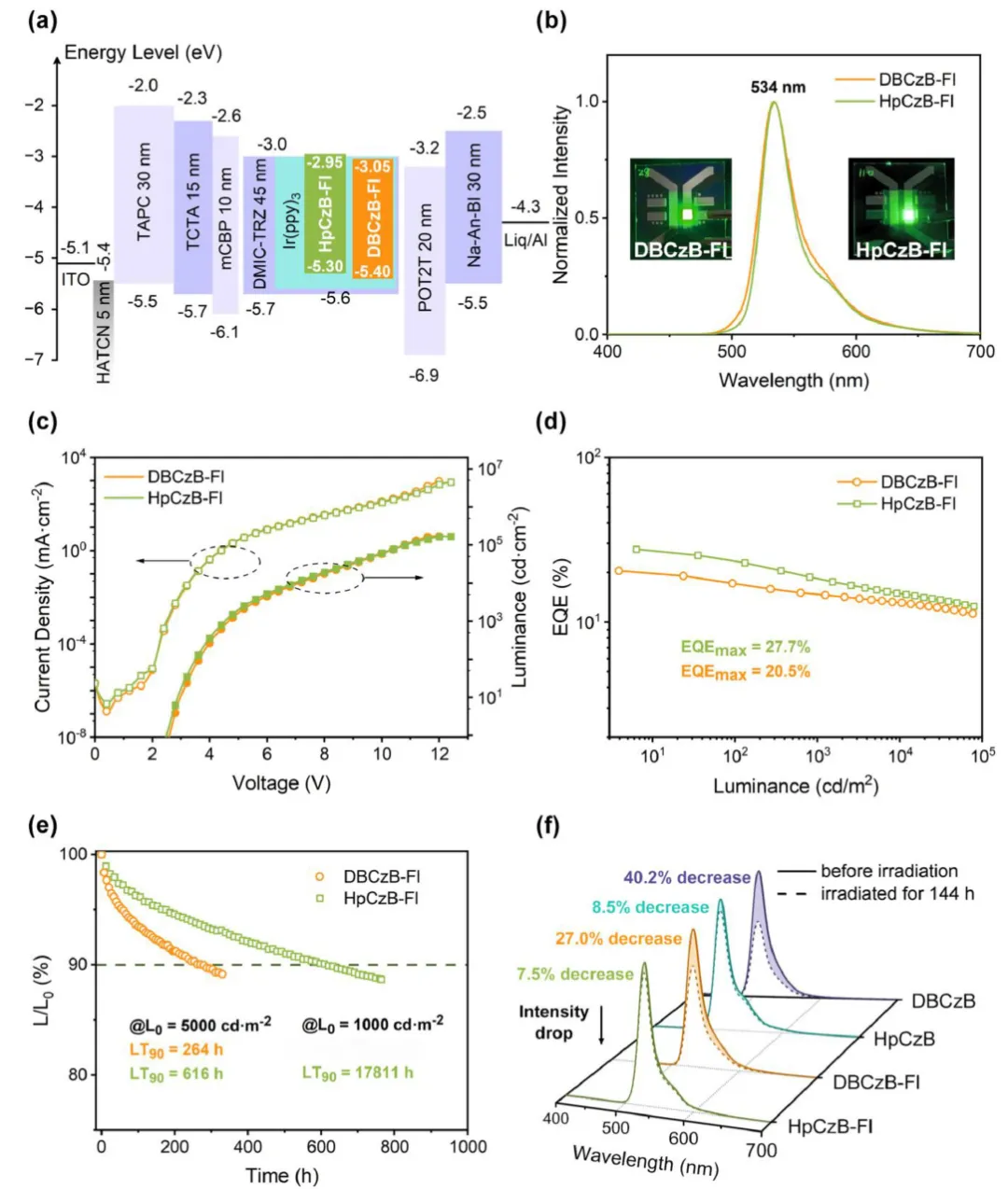 研究团队采用超荧光(Hyperfluorescence, HF)器件结构评估了分子的应用潜力。在发光层(EML)中,采用了双极性热活化延迟荧光(TADF)主体材料 DMIC-TRZ 和磷光敏化剂 Ir(ppy)3,以协同捕获三线态激子,并促进能量高效地转移至荧光发射体。高效率:基于HpCzB-Fl的器件实现了27.7%的最大外量子效率(EQE),电流效率为113.0 cd/A 。极致寿命:在1000 cd/m²的初始亮度下,器件的运行寿命LT90达到了惊人的17,811小时 。这一数值是其DBCz类似物(DBCzB-Fl)的2.3倍,充分证明了HpCz单元在提升BN框架稳定性方面的卓越作用 。🎓研究意义与未来展望