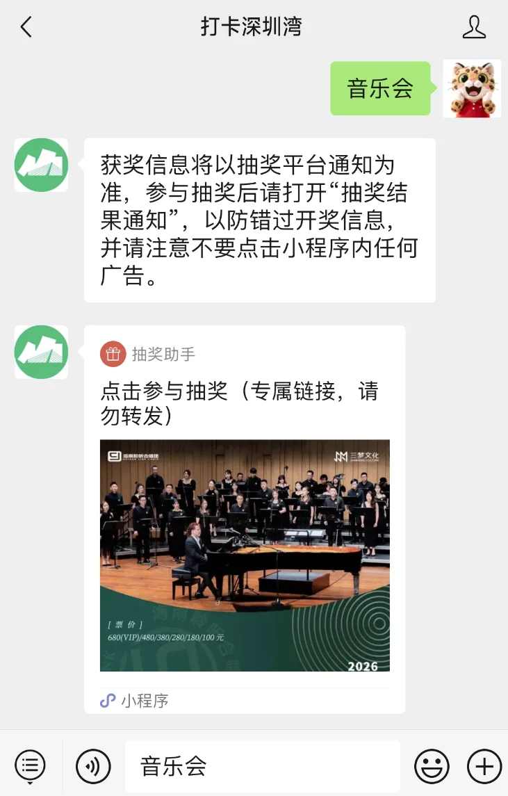 2.在后台回复关键词“音乐会”即可参与抽奖活动。
