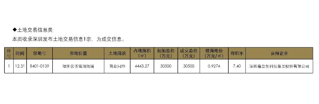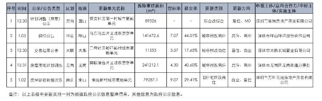 1.本周收录深圳城市更新项目信息5项,包括1则计划调整(草案)公示、1则招标公告、1则交易结果公告、1则房屋用地计划调出、1则房屋征收补偿决定