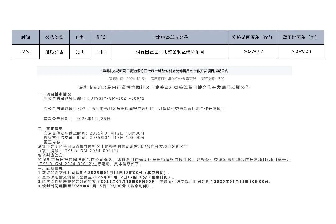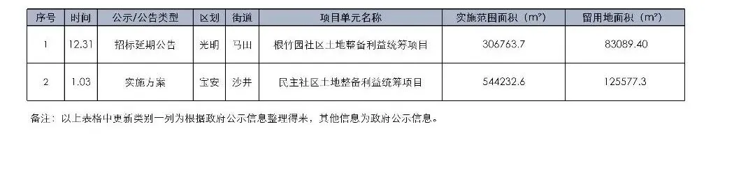 本周收录深圳土地整备利益统筹项目信息2项,分别是1则招标延期公告、1则实施方案公示