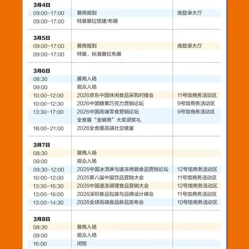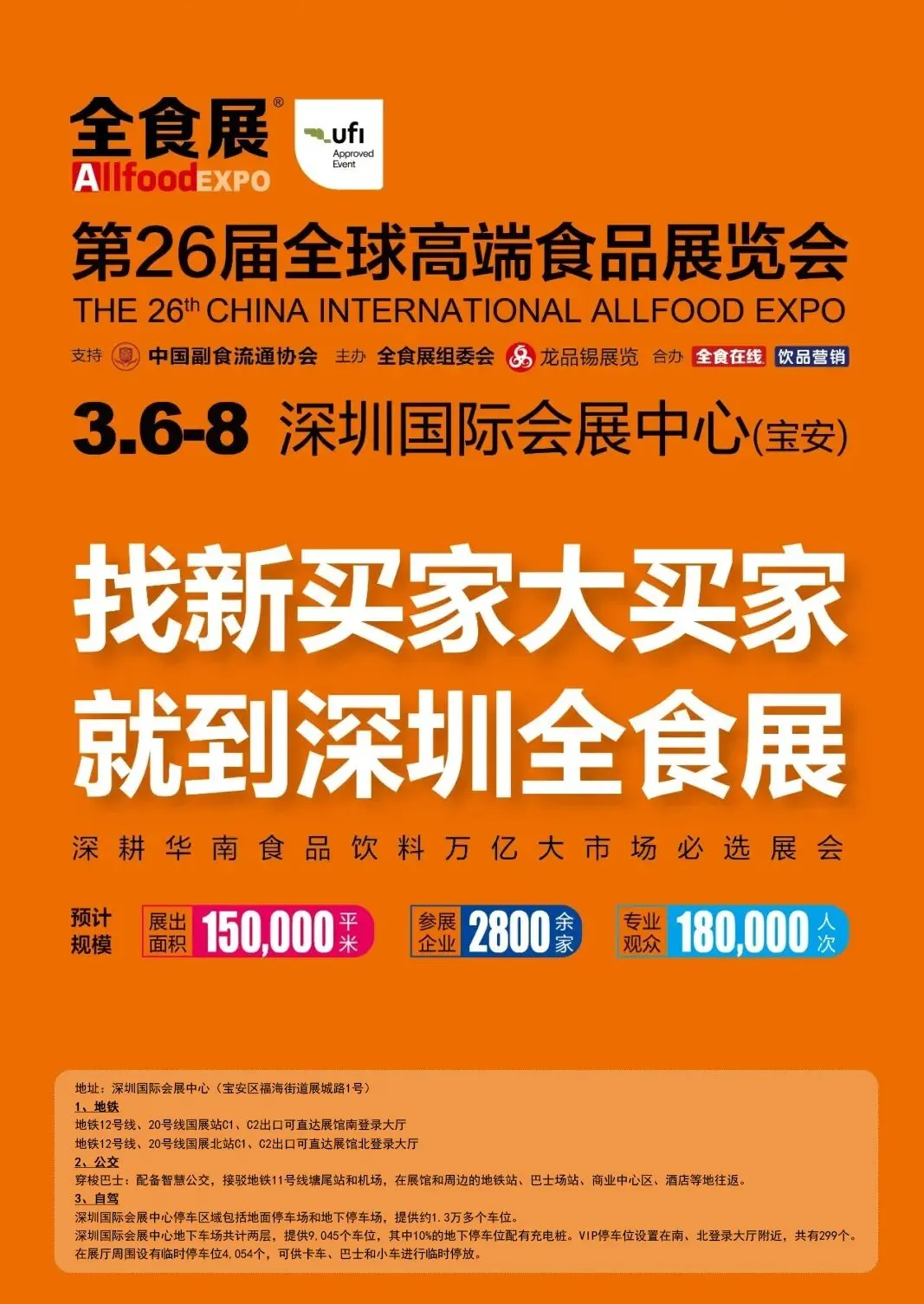 2026全球高端食品展览会(深圳全食展)将于3月6-8日在深圳国际会展中心(宝安)举行。同期将举办2026中国糖果零食展览会、2026深圳全国速冻食品展览会、第21届中国冰淇淋冷食展览会、第7届中国饮品产业展览会、2026中国无糖低GI食品饮料展览会等,规划展出面积15万平米,预计专业观众18万人次。