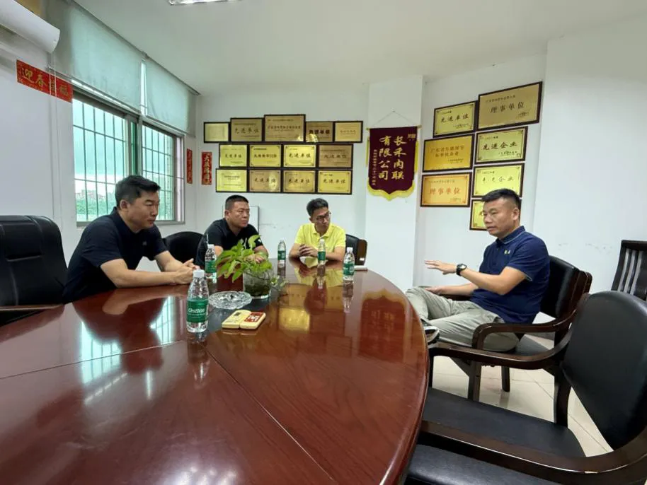 在中山市长禾肉联加工有限公司,考察组实地考察了当地最大的鲜肉生产加工厂,调研广东地区热鲜肉市场供需及活牛来源,共同商讨了“北牛南运”、建立“飞地”活畜静置交易市场和屠宰场、冷鲜肉供应等不同模式下的供应链成本,分析市场前景并形成广泛共识。