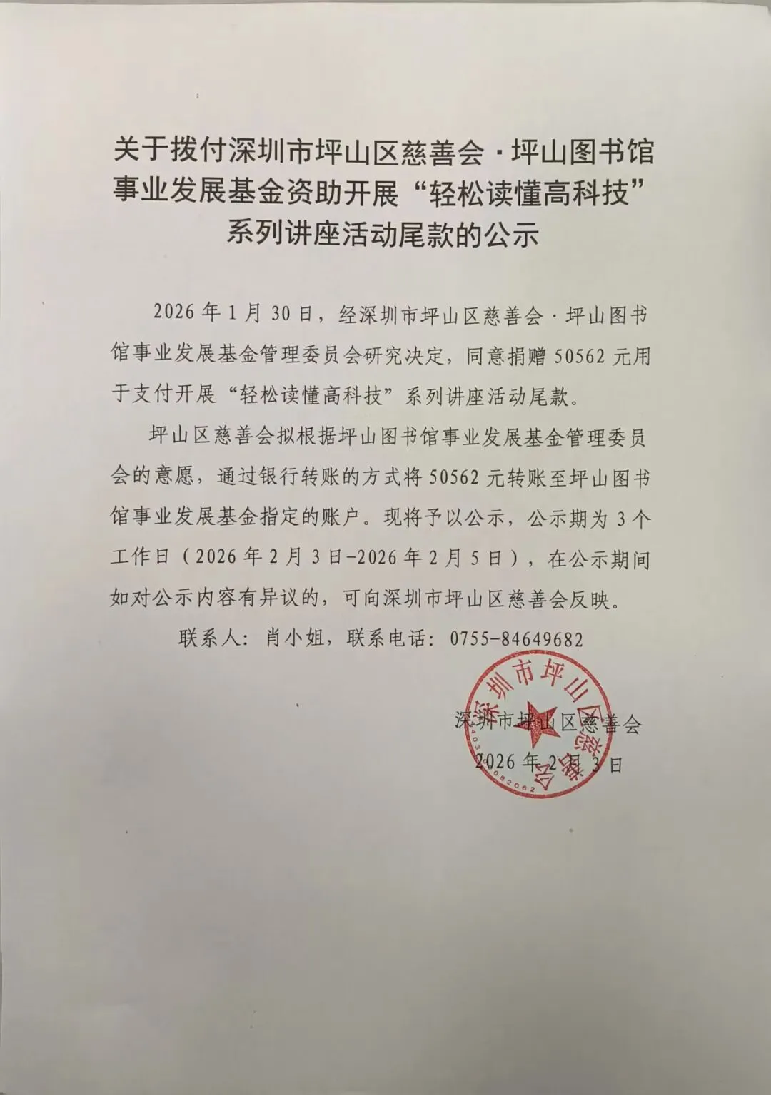 2026年1月30日,经深圳市坪山区慈善会·坪山图书馆事业发展基金管理委员会研究决定,同意捐赠50562元用于支付开展“轻松读懂高科技”系列讲座活动尾款。