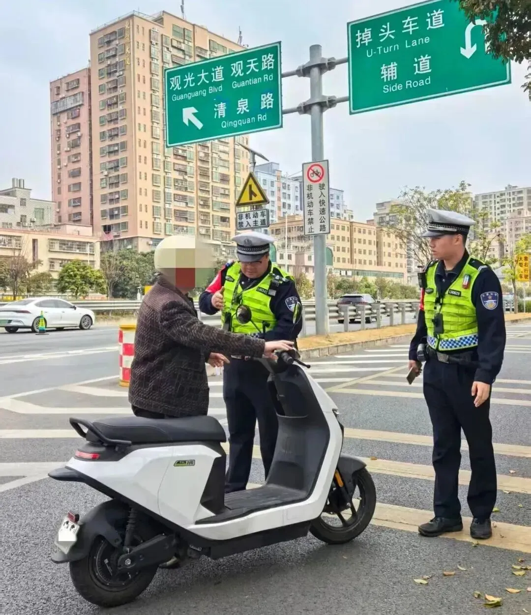 ▲龙华交警在龙澜大道大浪南路辅道处开展“链路式”整治时,查获违规驶入的电动自行车。