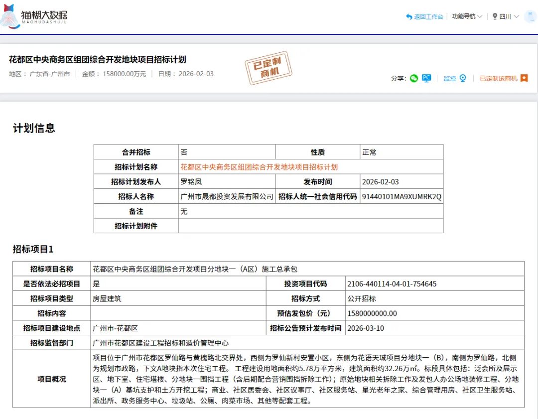 2026年2月3日,广东省招标投标监管网发布了花都区中央商务区组团综合开发地块项目招标计划。该项目预估发包价15.8亿元,涵盖住宅、商业及配套设施建设,为建筑行业相关企业提供了丰富的商业机会。