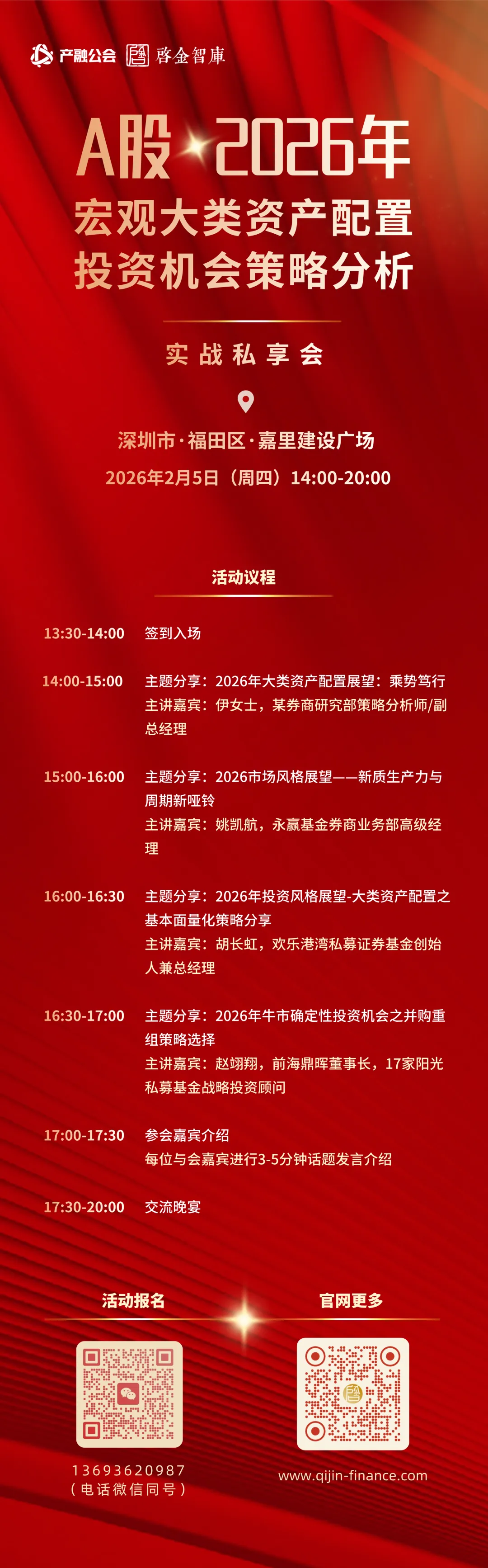 启金智库&产融公会 将于 2026年2月5日(周四)下午14:00-20:00 在 深圳 举办《A股2026年宏观大类资产配置与投资机会策略分析实战私享会》,欢迎您的加入!