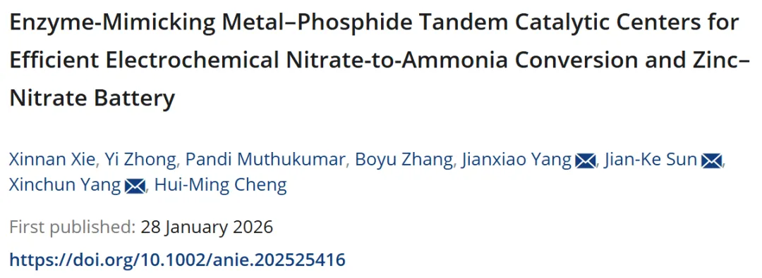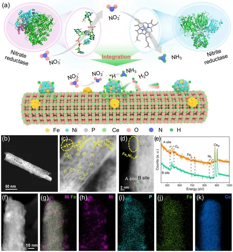 揭示了酶模拟接力催化机制:Fe团簇模拟硝酸还原酶,催化硝酸盐还原为亚硝酸盐;相邻的FeₓNi₂₋ₓP纳米颗粒模拟亚硝酸还原酶,催化亚硝酸盐进一步加氢生成氨,双位点的空间耦合有效避免了中间产物积累。