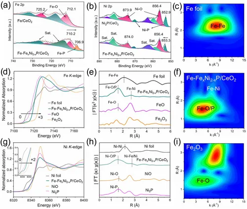 图2g-i的Ni K-edge XAFS相关图谱显示,Ni的吸收边特征与Ni₂P相似,EXAFS谱中检测到Ni-O/P、Ni-Ni和Ni-Fe配位峰,进一步证实了FeₓNi₂₋ₓP的形成。