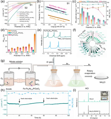 图3a的LSV曲线显示,添加硝酸盐后,Fe-FeₓNi₂₋ₓP/CeO₂的电流密度显著提升,且起始电位正移,说明其具有优异的硝酸盐还原反应活性;曲线中存在两个反应区域,分别对应硝酸盐到亚硝酸盐的还原和亚硝酸盐到氨的加氢过程。