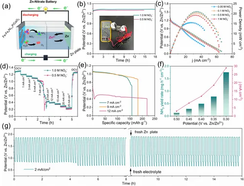 以该纳米酶为阴极构建的可充电锌-硝酸盐电池,兼具产氨和发电功能,开路电压达1.31 V,峰值功率密度为21.1 mW cm⁻²,氨产率为1.9 mg h⁻¹ cm⁻²,且能稳定充放电循环约16 h。