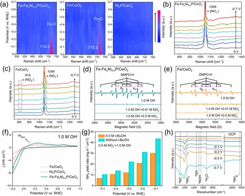 图5h的原位FTIR光谱检测到*NO₃、*NO₂、*NO、*NH等一系列中间体信号,揭示了硝酸盐还原制氨的反应路径。