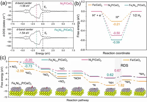 图6a的d轨道态密度(d-DOS)计算显示,Fe掺杂后Ni₂P中Ni的d带中心从-1.56 eV上移至-1.54 eV,电子结构的调控优化了中间体的吸附能。