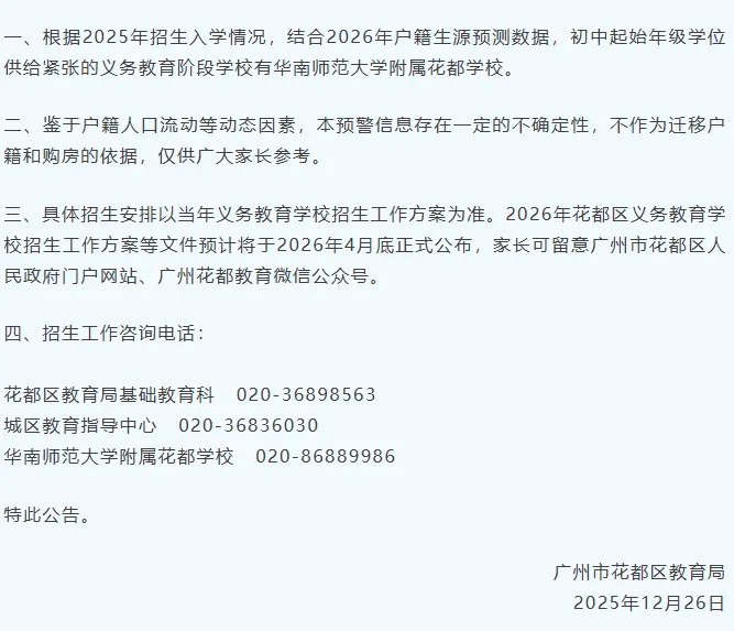 另据花都区教育局消息,根据2025年招生入学情况,结合2026年户籍生源预测数据,初中起始年级学位供给紧张的义务教育阶段学校有: