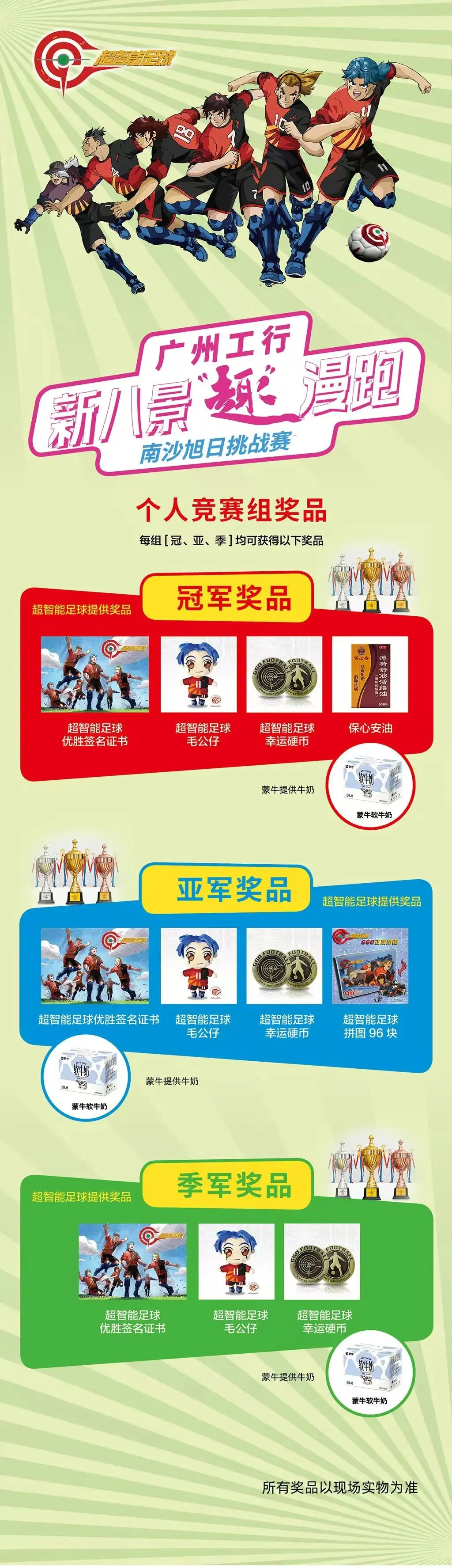 特色:采用专业芯片计时,分年龄组评选男女子冠亚季军。路线从二期出入口出发,沿湿地栈道穿梭,掠过红树林芳踪,迎着珠江口朝阳冲刺,沿途设置补给站、医疗站及《超智能足球》主题打卡点,竞技激情与生态美景完美交融。冠亚季军除常规奖励外,额外加赠《超智能足球》典藏周边礼盒。