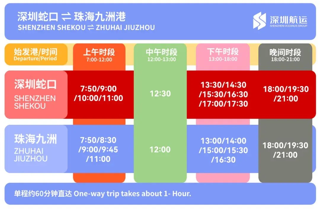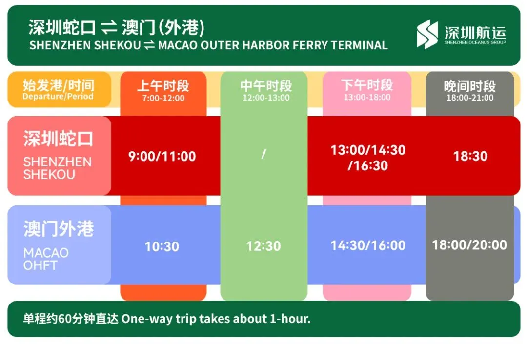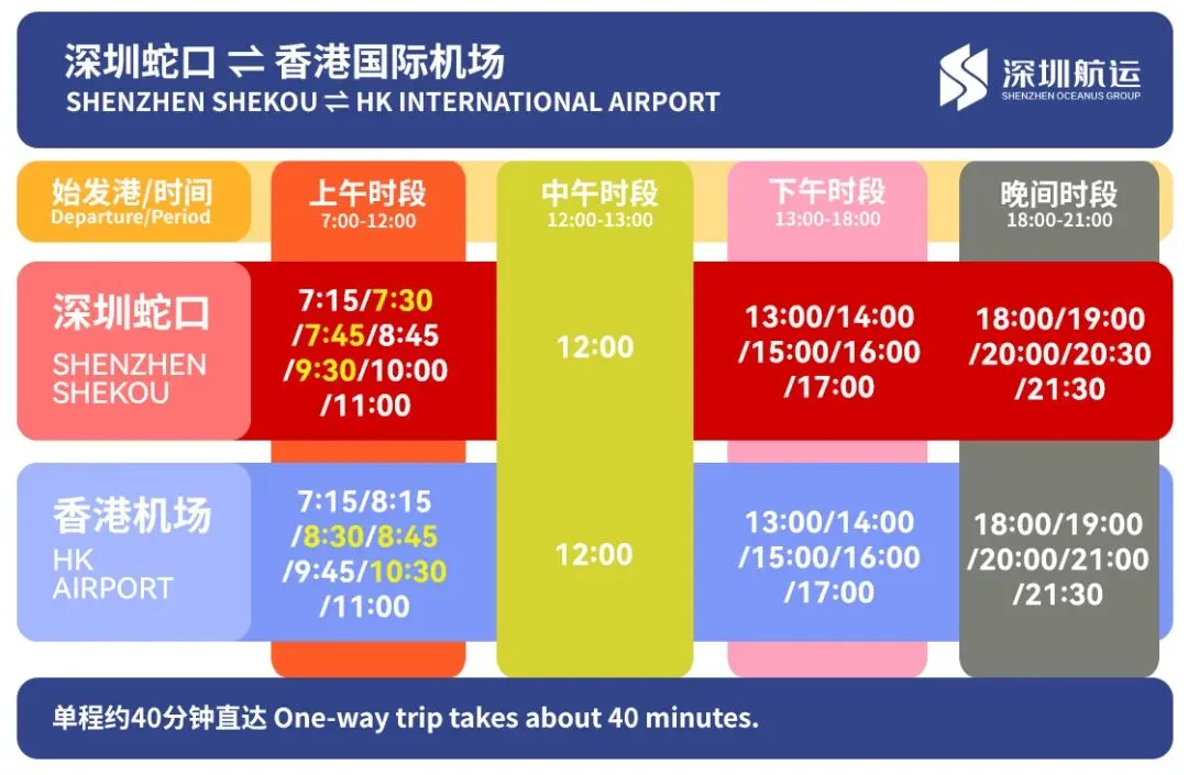 推荐班次:去程:蛇口 7:15 / 9:30(赶早班机);返程:香港机场 18:00 / 20:00(衔接晚间航班)