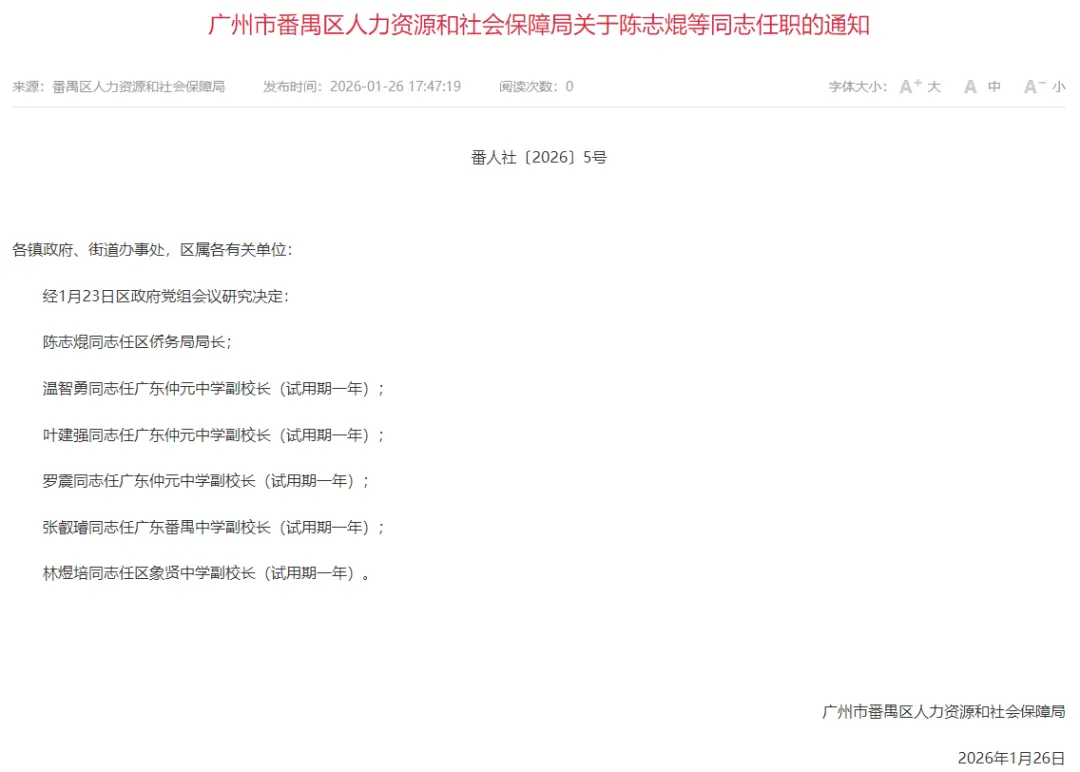 1月26日,广州市番禺区人力资源和社会保障局发布了关于陈志焜等同志任职的通知。