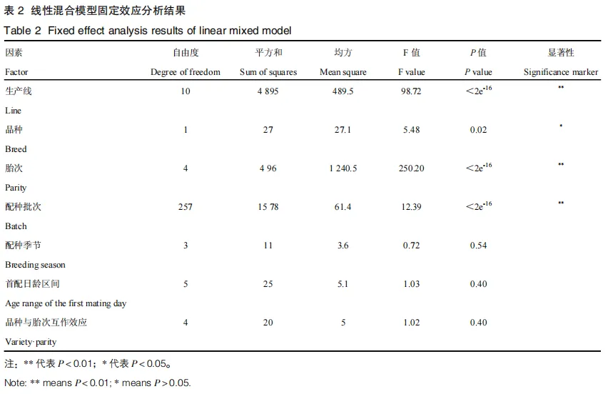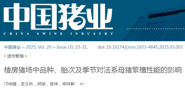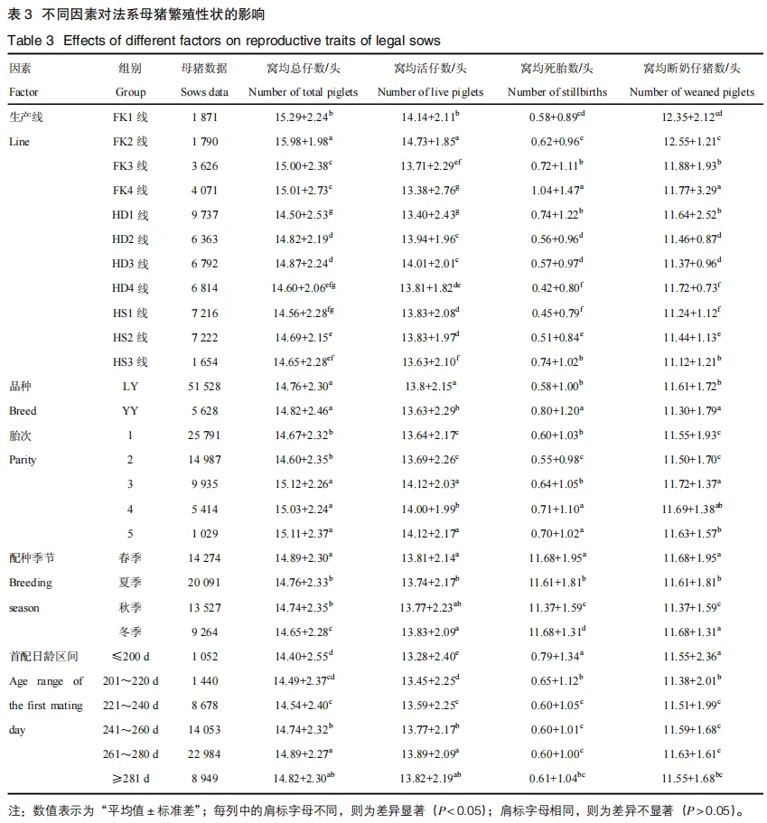 Abstract: This study aimed to investigate the effects of breed, parity, and mating season on reproductive traits of French-derived sows in multi-story pig farms. Based on data from 33 452 French-derived sows across three multi-story pig farms in South China and Southwest China, delivery records of Landrace sows (YY) and Landrace×Yorkshire crossbred sows (LY) were statistically analyzed using R4.4.2 software. A Linear Mixed Model (LMM) was applied to evaluate differences in reproductive performance across production lines, breeds, parities, and mating seasons. The results demonstrated that production line, breed, and parity were the most significant factors influencing reproductive traits (P<0.01). Compared with YY purebred sows, LY crossbred sows exhibited a 1.25% increase in average live-born piglets per litter, a 2.74% increase in average weaned piglets per litter, and a 27.5% reduction in average stillborn piglets per litter. Furthermore, sows at parity 3 demonstrated 3.07%, 3.56%, 0.6%, and 0.07% higher total born piglets, along with 3.52%, 3.14%, 0.86%, and 0% higher live-born piglets relative to parities 1, 2, 4, and 5, respectively. Regarding seasonal variations, sows farrowing in spring produced 0.88%, 1.02%, and 1.64% more total born piglets than those farrowing in summer, autumn, and winter. For first-mating gilts, those bred at 261 to 280 days of age showed superior reproductive outcomes: total born piglets were 3.4%, 2.76%, 2.41%, 1.02%, and 0.47% higher, while live-born piglets were 4.59%, 3.27%, 2.21%, 0.87%, and 0.51% higher compared to gilts bred in the ≤200 d, 201 to 220 d, 221 to 240 d, 241 to 260 d, and ≥281 d of age brackets, respectively.