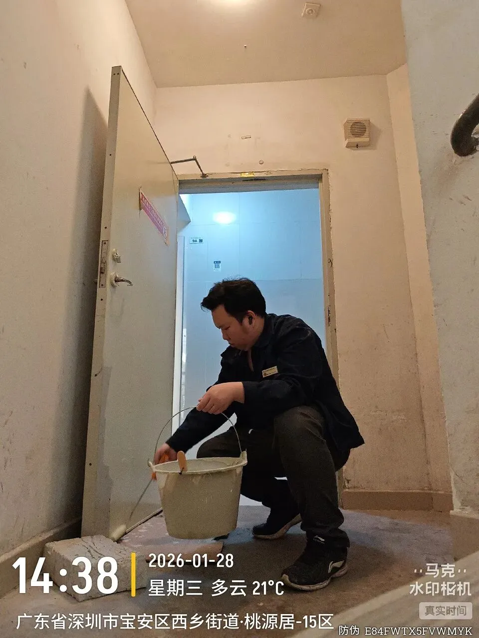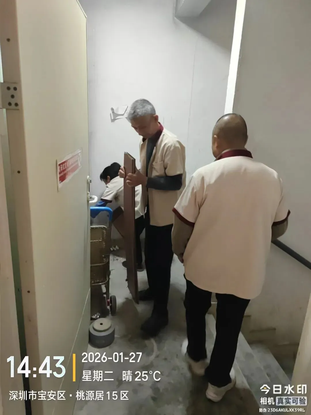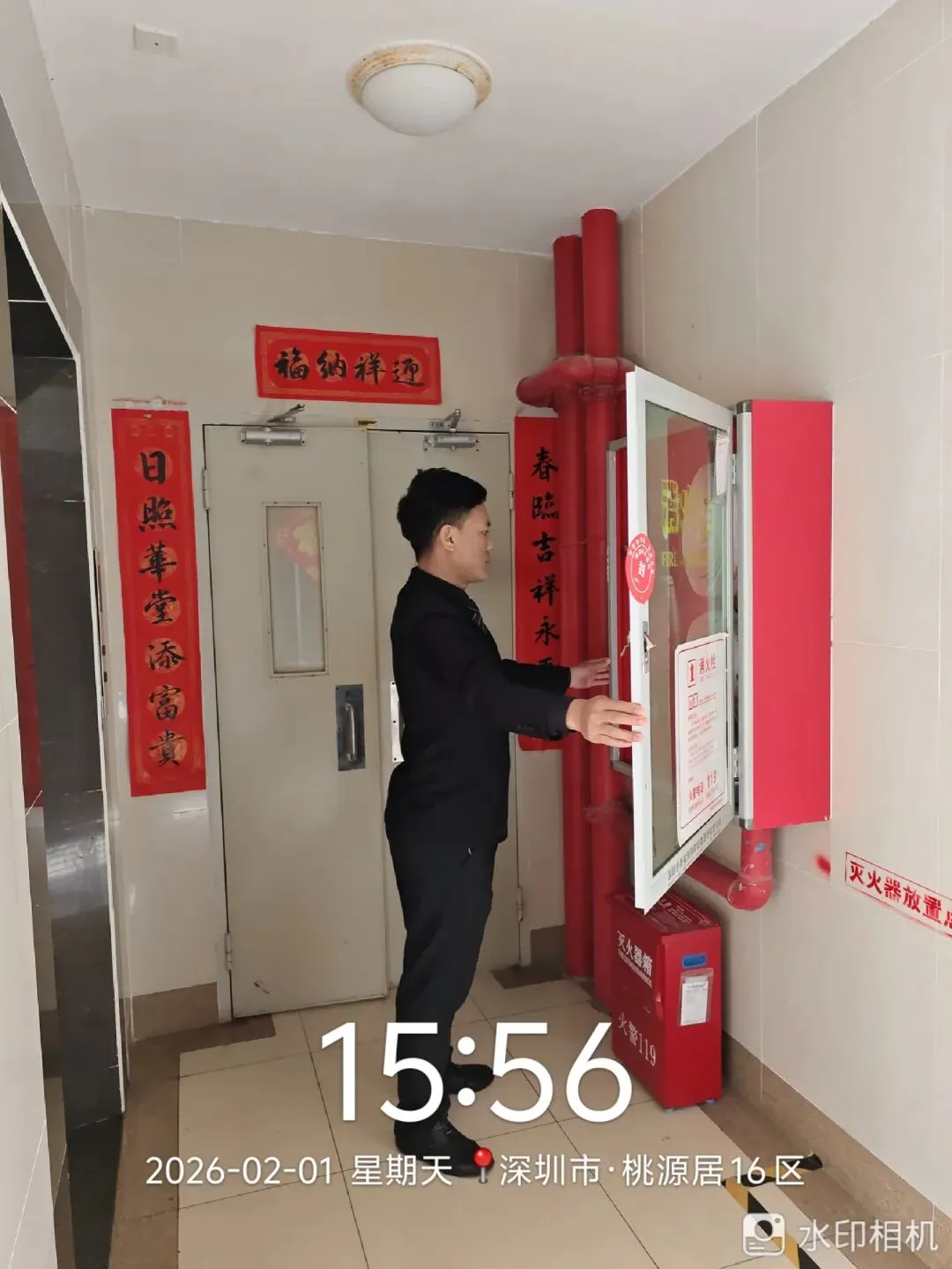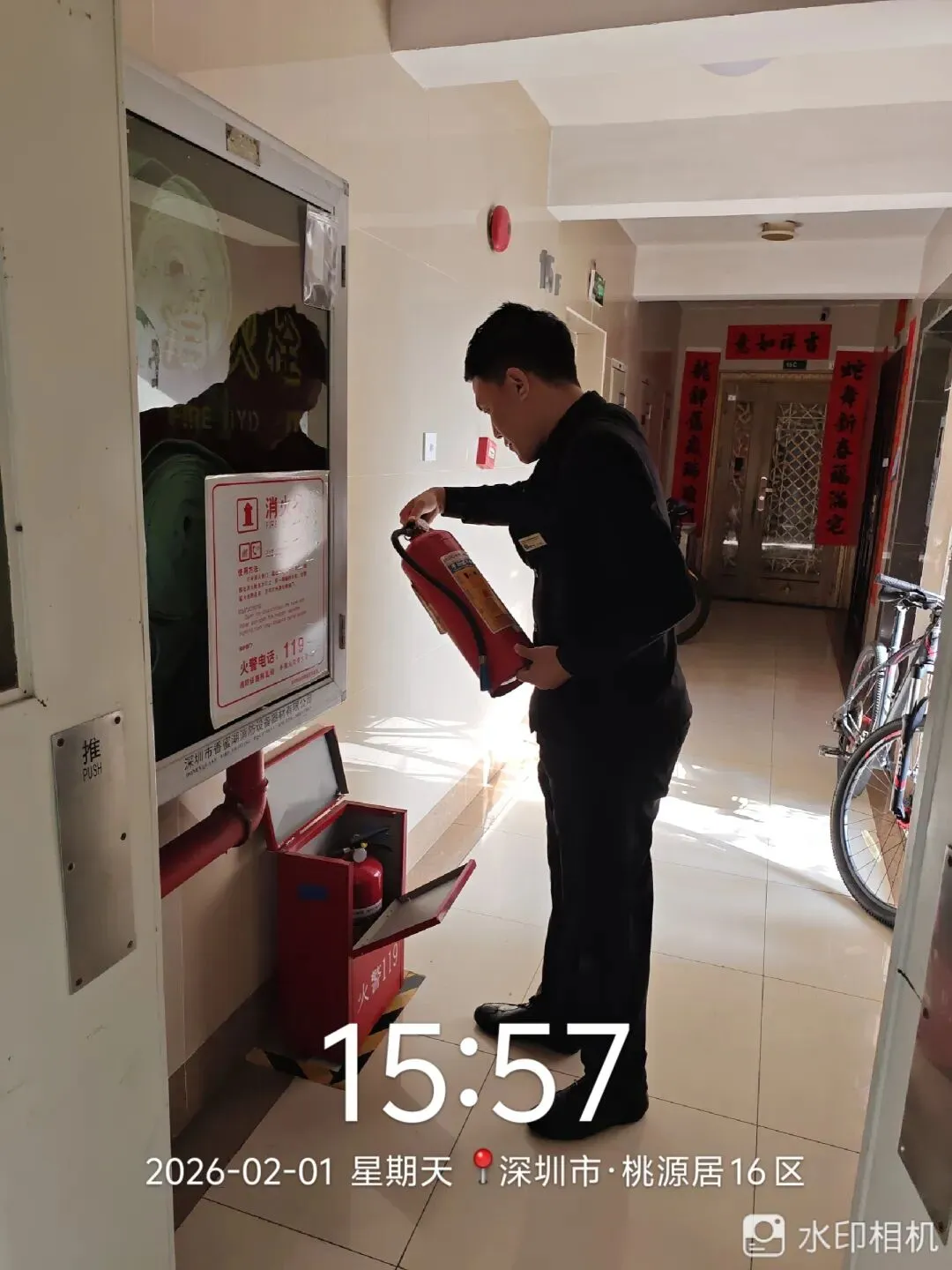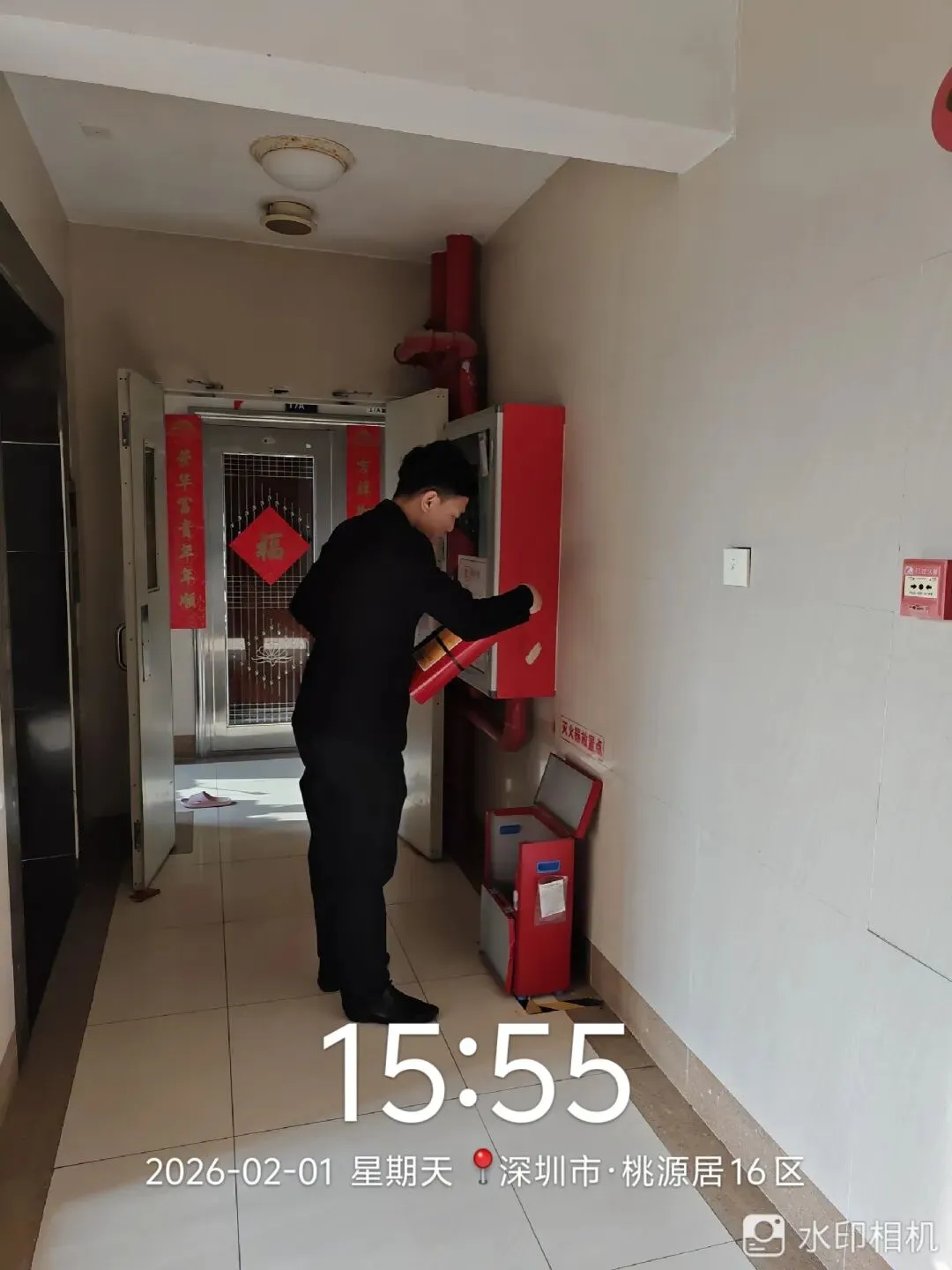 5、消防器材月检:组织秩序员对消防器材、灭火器、消火栓进行月度检查,确保都处于正常使用状态。6、截至2026年2月2日,物业管理处本年度累计受理应急专项维修事务40单。经业委会审核并完成现场报备的共计33单,剩余7单待协调业主完成现场勘查。7、维修损坏的监控、门禁设备共39处。8、完成对各区单元楼层部分防火门变型、门合页损坏、闭门器缺失、水电井门锁损坏,部分生锈安装铁皮,检查维修更换,除锈刷漆。本周已完成9处,累计已完成105处。9、完成对各区主出入口拉铁丝、挂灯笼、布电源线共12处。10、本周重点对桃源居所有垃圾分类点箱罩内外、桶体、排水沟、排水井等进行了全面彻底的冲洗清洁工作。