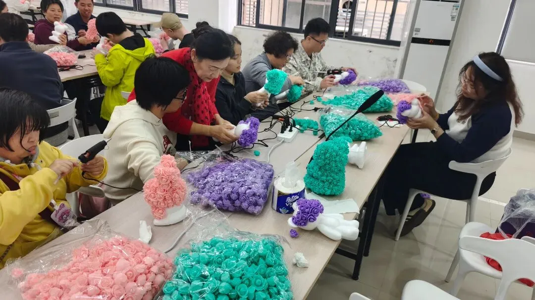 此次培训以市场需求为导向,聚焦生活美学消费领域,设计以永生花制作为核心的课程体系,涵盖材料认知、工艺实操、创意设计、市场分析及销售入门等多个模块,旨在帮助学员实现从技能学习到实际创收的能力转化。