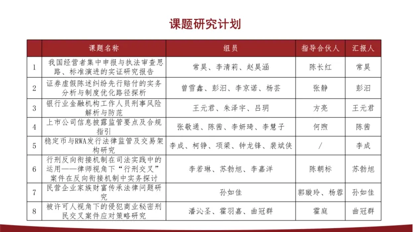本次结题汇报共涵盖8个课题,涉及多个前沿领域,充分体现了青年律师对实务问题的深度思考。汇报过程中,各小组通过实证分析、案例解读与制度优化建议,展现了扎实的研究能力和专业水准。