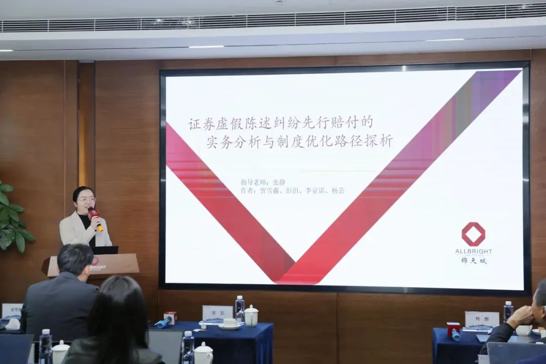图为管委会委员、高级合伙人何煦律师为《证券虚假陈述纠纷先行赔付的实务分析与制度优化路径探析》课题组颁奖