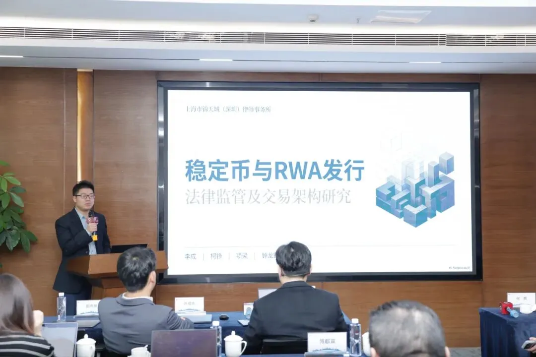 图为监委会主委、高级合伙人冯成亮律师为《稳定币与RWA发行法律监管及交易架构研究》课题组颁奖