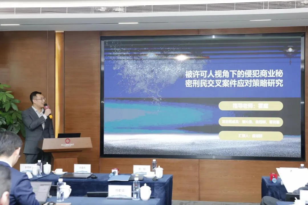 图为一级合伙人胡云云律师为《被许可人视角下的侵犯商业秘密刑民交叉案件应对策略研究》课题组颁奖
