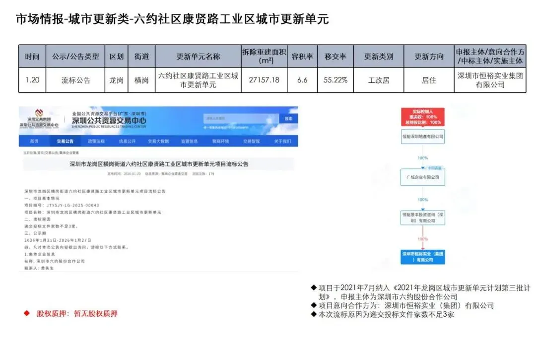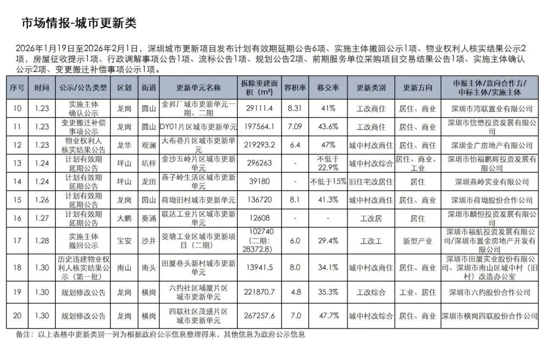 1月19日至2月1日,深圳城市更新项目发布计划有效期延期公告6项、实施主体撤回公示1项、物业权利人核实结果公示2项,房屋征收提示1项、行政调解事项公告1项、流标公告1项、规划公告2项、前期服务单位采购项目交易结果公告1项、实施主体确认公示2项、变更搬迁补偿事项公示1项