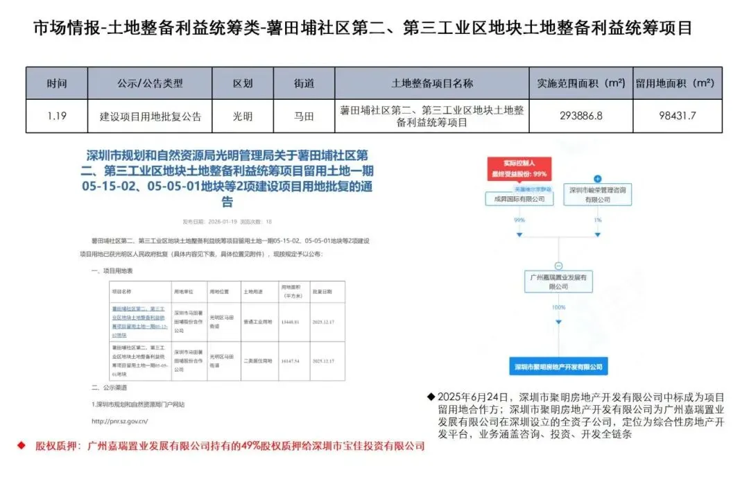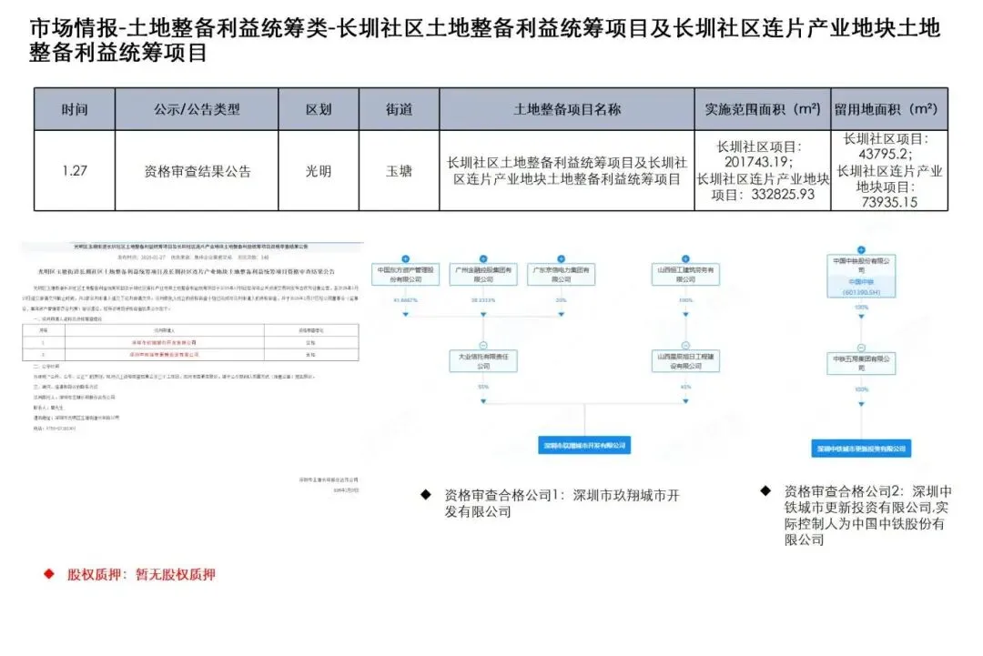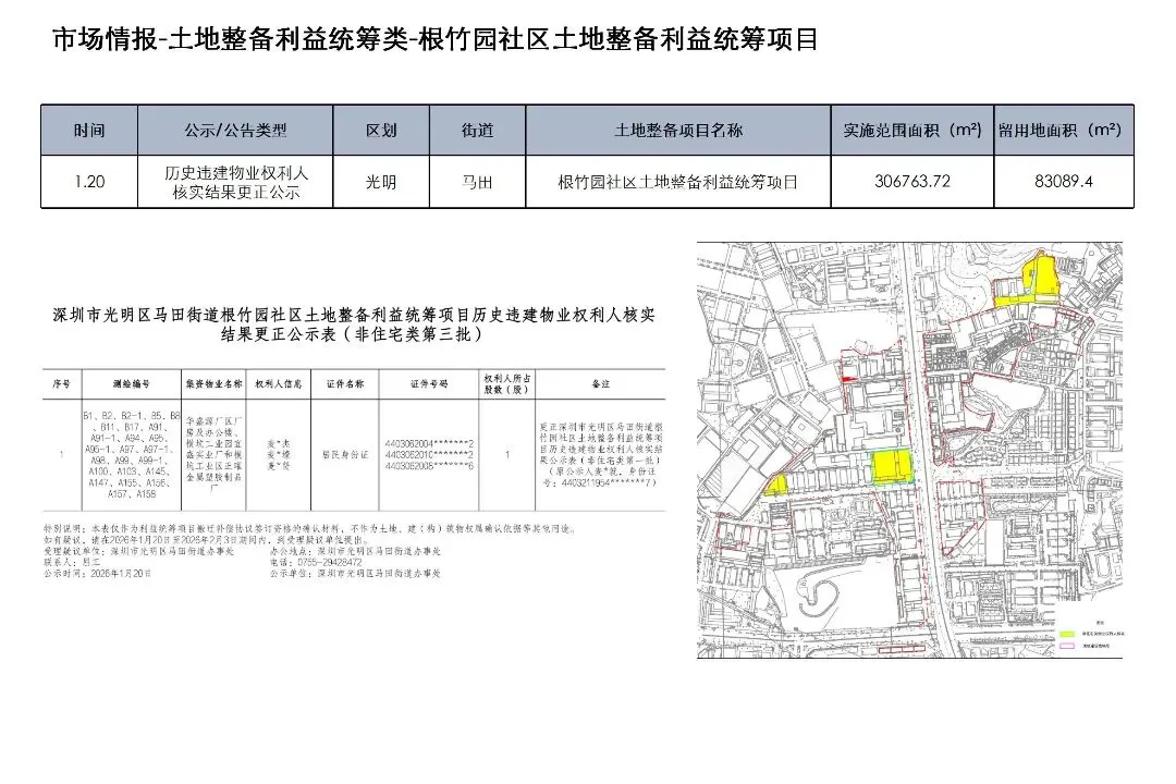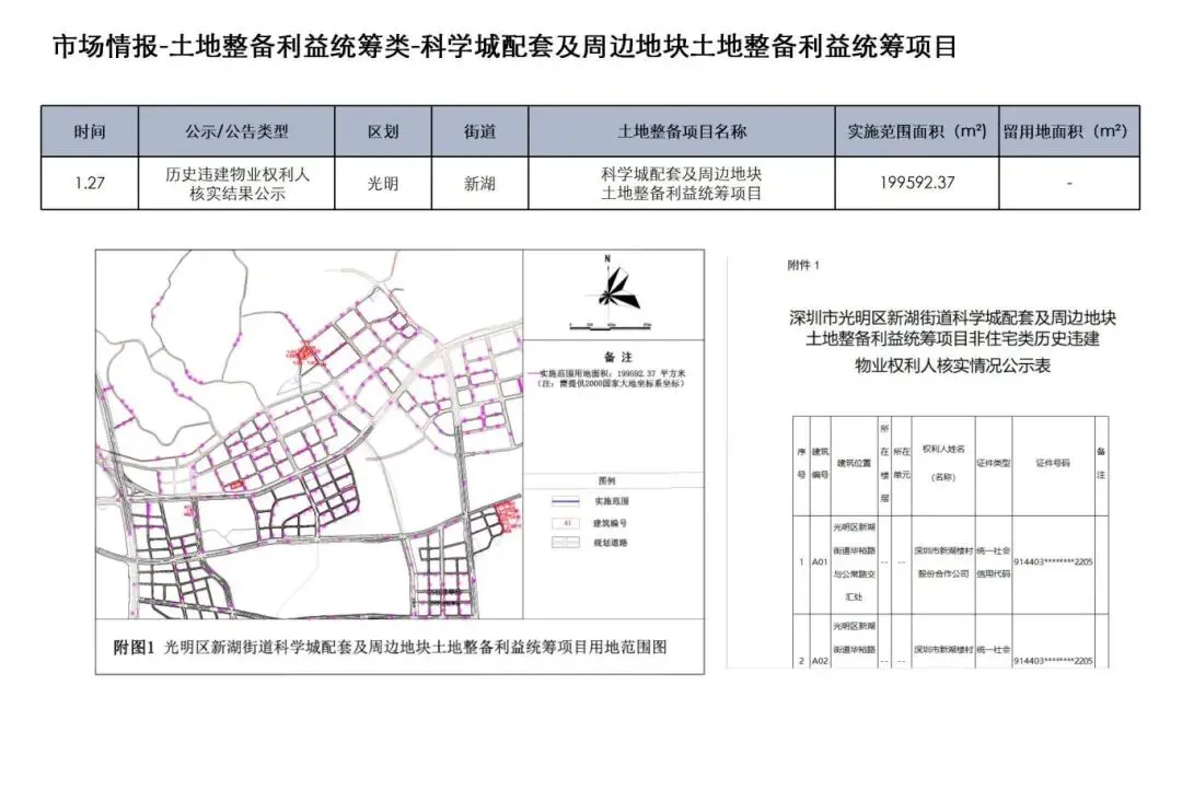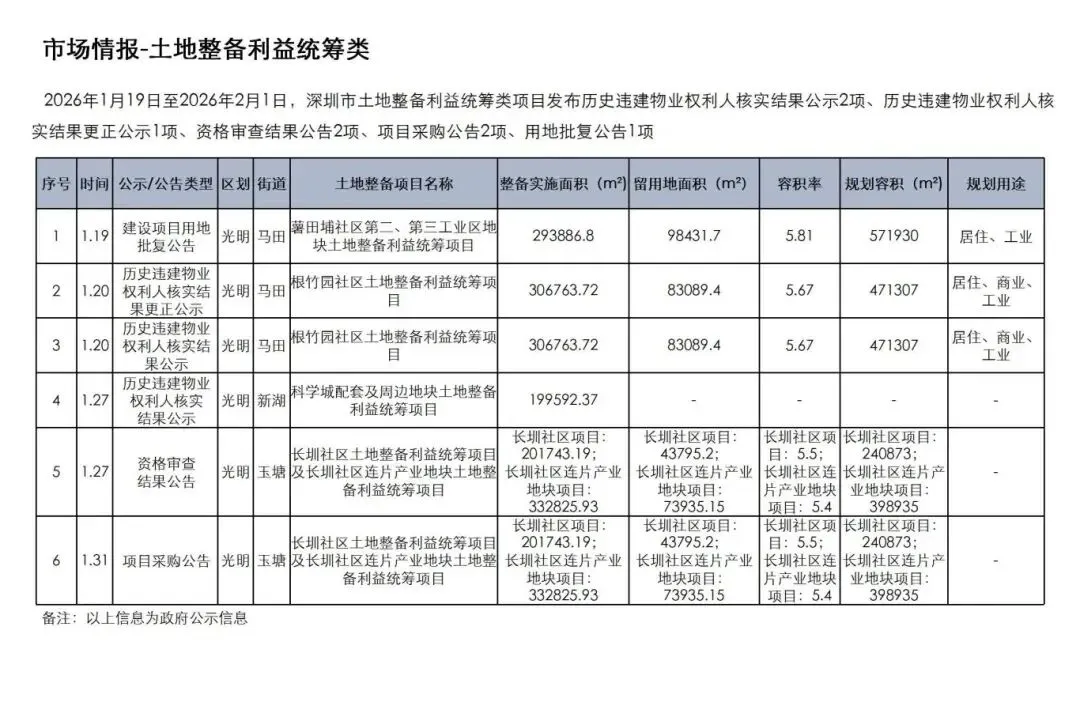 1月19日至2月1日,深圳市土地整备利益统筹类项目发布历史违建物业权利人核实结果公示2项、历史违建物业权利人核实结果更正公示1项、资格审查结果公告2项、项目采购公告2项、用地批复公告1项