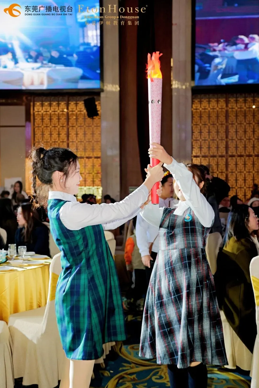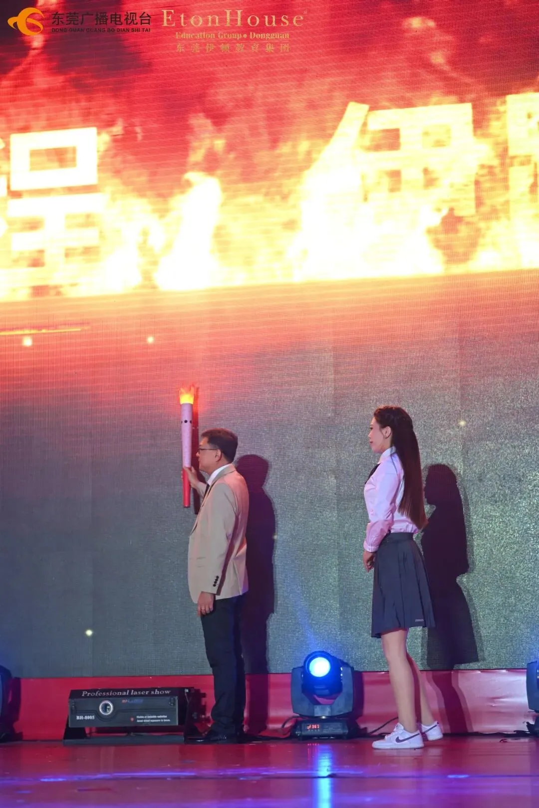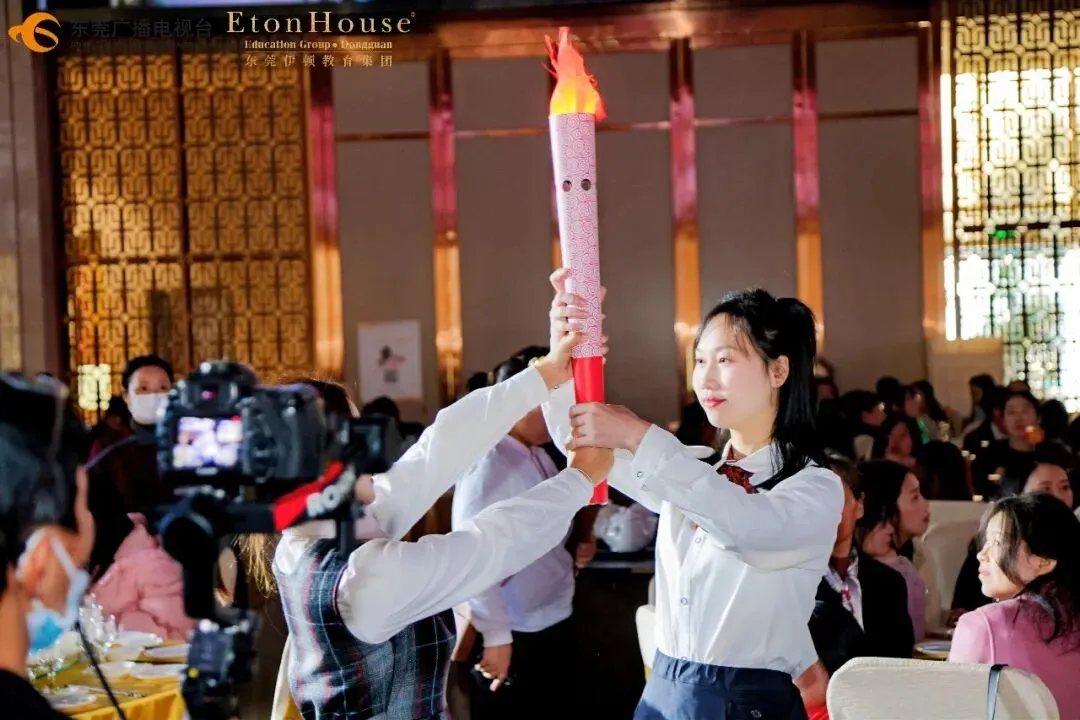 活动正式开始前,会场精心布置了多处主题拍照打卡点。教职工们陆续到场,在合影墙前驻足留念,在趣味相框中展露笑颜,在“骉驰新程”的主题背景前记录下相聚的喜悦。一张张灿烂的笑脸,一个个温暖的瞬间,为整场活动拉开了温馨欢愉的序幕。活动以庄重而温馨的“薪火相传”仪式拉开序幕。从幼儿园、小学、初中、高中到国际部,五个学段的火炬队依次传递,象征伊顿教育从启蒙到国际化的完整教育链。最终,火炬由董事长董旭原先生接过,共同点亮2026年的新征程,寓意集团教育事业薪火相传、光明无限。