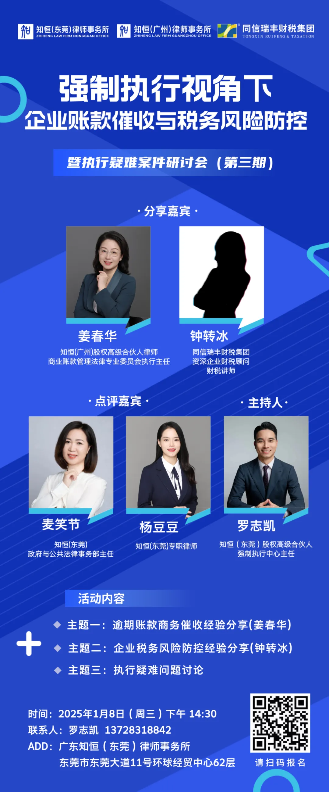 强执中心联合知恒广州分所、同信瑞丰财税集团举办研讨会,首次将强制执行前置化,聚焦企业逾期账款催收与回款后的税务风险,现场并为6家顾问单位颁发法律顾问证书。