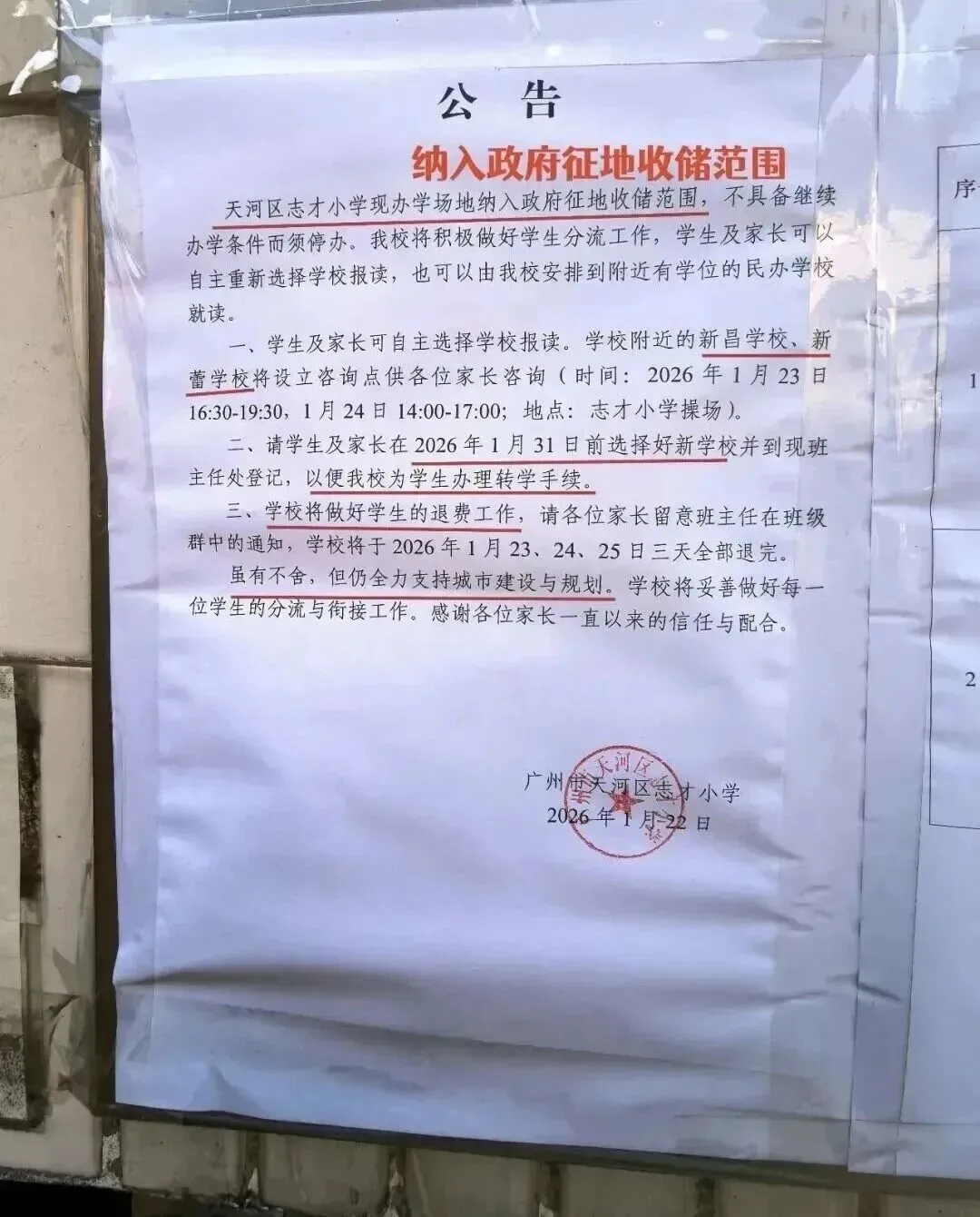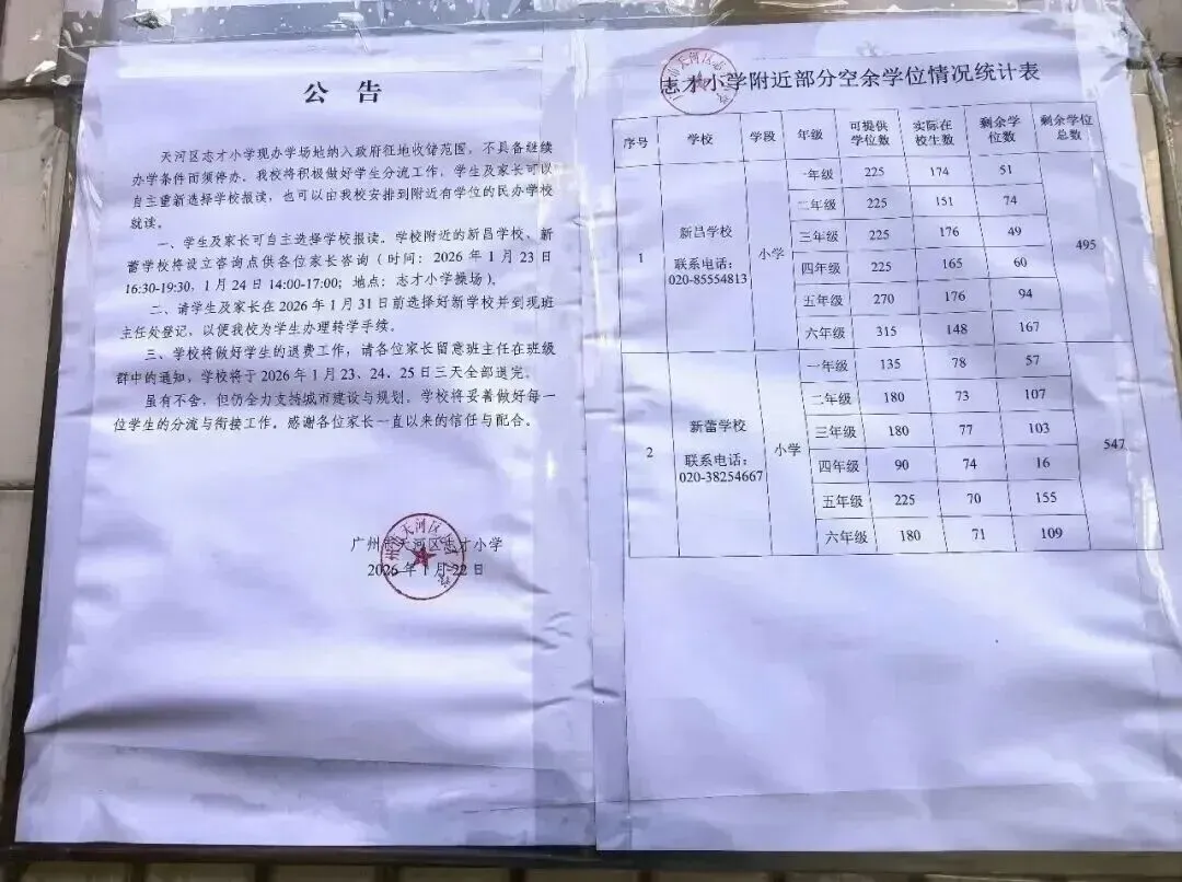网传通告显示,天河区志才小学的办学场地被纳入政府征地收储范围,因不再具备办学条件,学校将正式停办。该校学生及家长可自主重新择校报名,也可由学校统筹安排至周边有学位的民办学校就读。