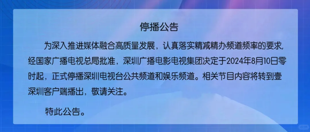 早在2024年8月10日,深圳广播电影电视集团就已经关停了深圳电视台公共频道和娱乐频道。