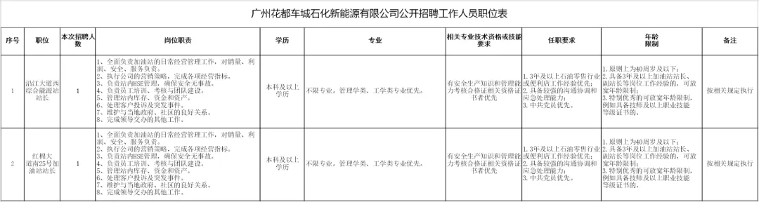 本次公开招聘站长共2名,具体招聘职位及资格条件详见《广州花都车城石化新能源有限公司公开招聘工作人员职位表》(附件1),相关专业名称及代码参照《广东省2026年考试录用公务员专业参考目录》(附件2)。