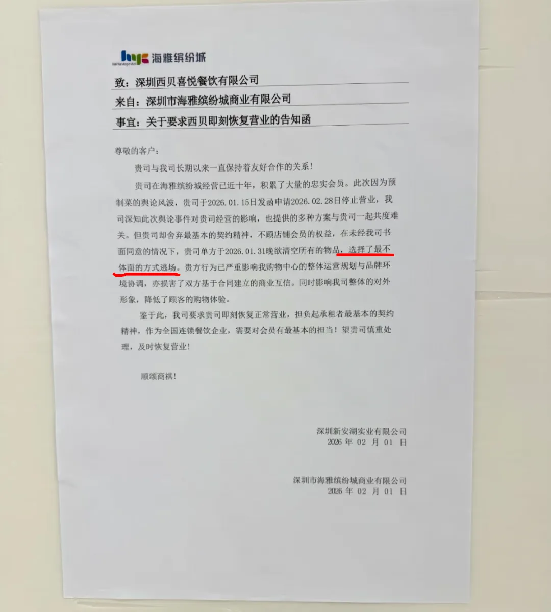 近日,一张深圳某商场内张贴的《关于要求西贝即刻恢复营业的告知函》在社交媒体流传。函中指出,西贝在此经营已近十年,此前因预制菜舆论影响,曾于1月15日申请2月28日停止营业。然而,西贝在未获商场书面同意的情况下,于1月31日晚欲清空店内物品,被指采取“最不体面”的“逃场”行为。商场因此要求西贝立即恢复营业。